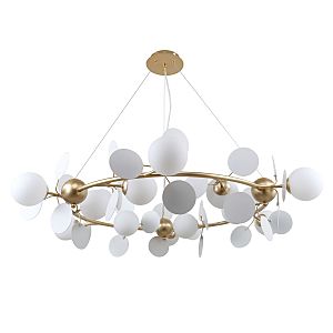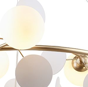 Каркас золотого цвета, круглые стеклянные плафоны молочного цвета, декоративные круглые белые пластины, декоративные золотые шары