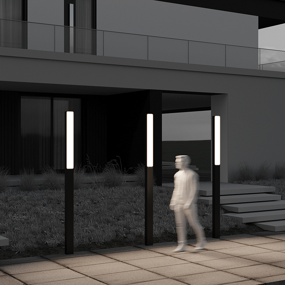 Материал арматуры - алюминий, цвет - графит. Рассеиватель из белого матового акрила - мягко рассеивает свет. Два размера - 1000 мм и 2500 мм. Мощность 20Вт и 40Вт для высокого светильника. LED-источник света. Цветовая температура 3000К. Защита корпуса от пыли и влаги - IP65. Подходят для основного освещения экстерьера.