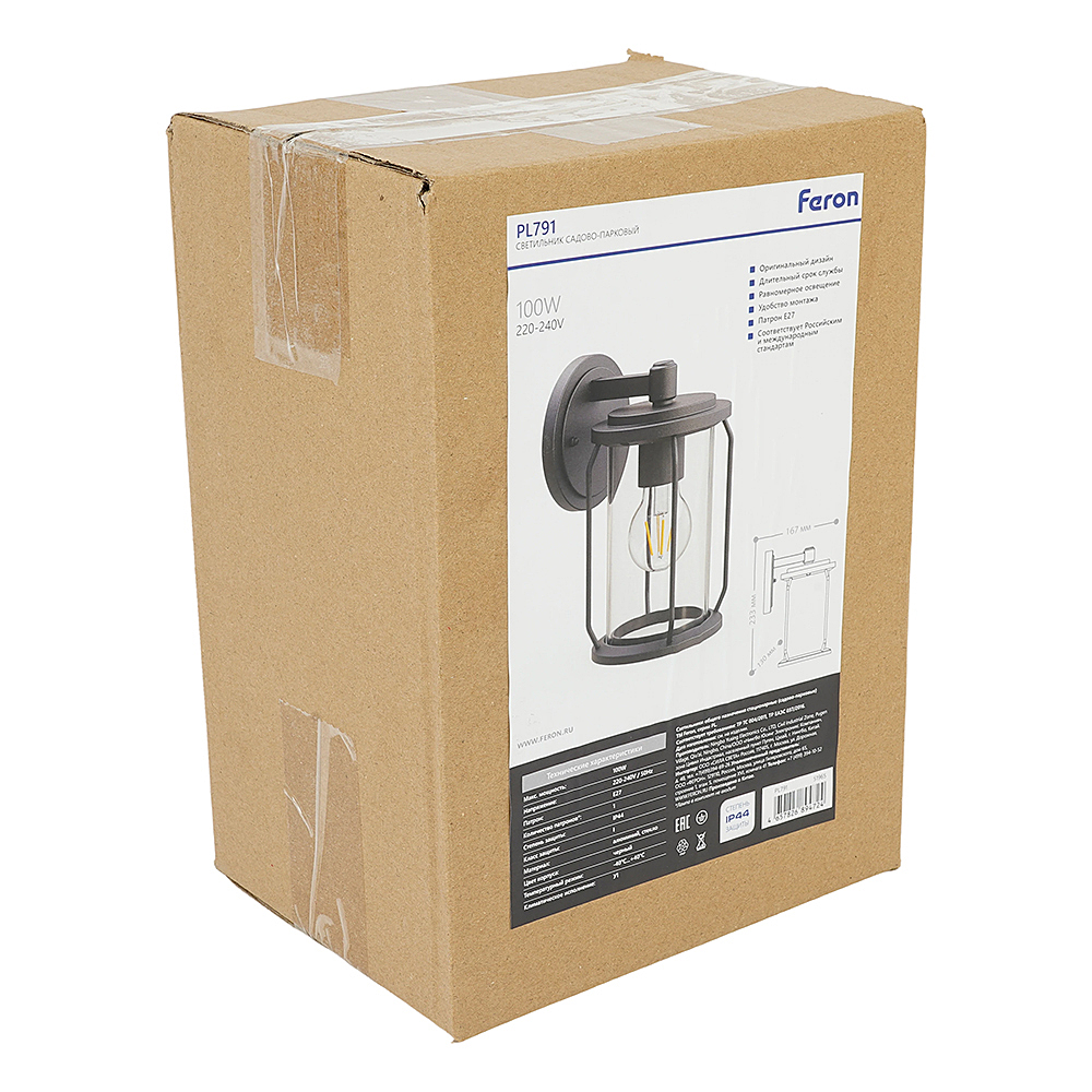 Светильник садово-парковый, серии ?Болонья?, (НБУ) FERON PL791 E27, 220-240V, IP44, цвет черный, на стену вниз, 167*130*233мм