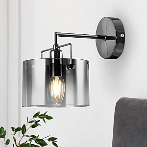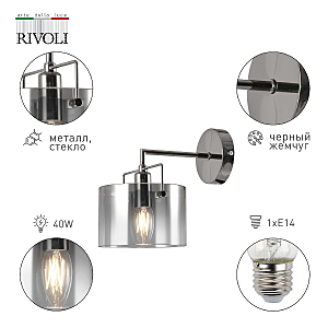 Бра-светильник настенный Rivoli Bonnie (арт. 2078-401) в стиле современная классика. Беспроигрышное решение для оформления дизайнерских интерьеров и преображения любого пространства. Бра настенное выполнено из металла и стекла. Плафон диаметром 150 мм имеет форму традиционного абажура. Дымчатая тонировка плафона смягчает яркость света, что идеально для дополнительного освещения. Арматура бра красивого цвета чёрный жемчуг. Геометричный рожок с декоративными элементами в стиле лофт. Светильник настенный Bonnie от итальянских дизайнеров Rivoli освещает площадь до 3 м2.Основу коллекции Rivoli Bonnie составляют люстры под 5 и 7 ламп (арт. 2078-305 и 2078-307). Люстры и бра Bonnie применяются с лампами Е14 40 Вт.