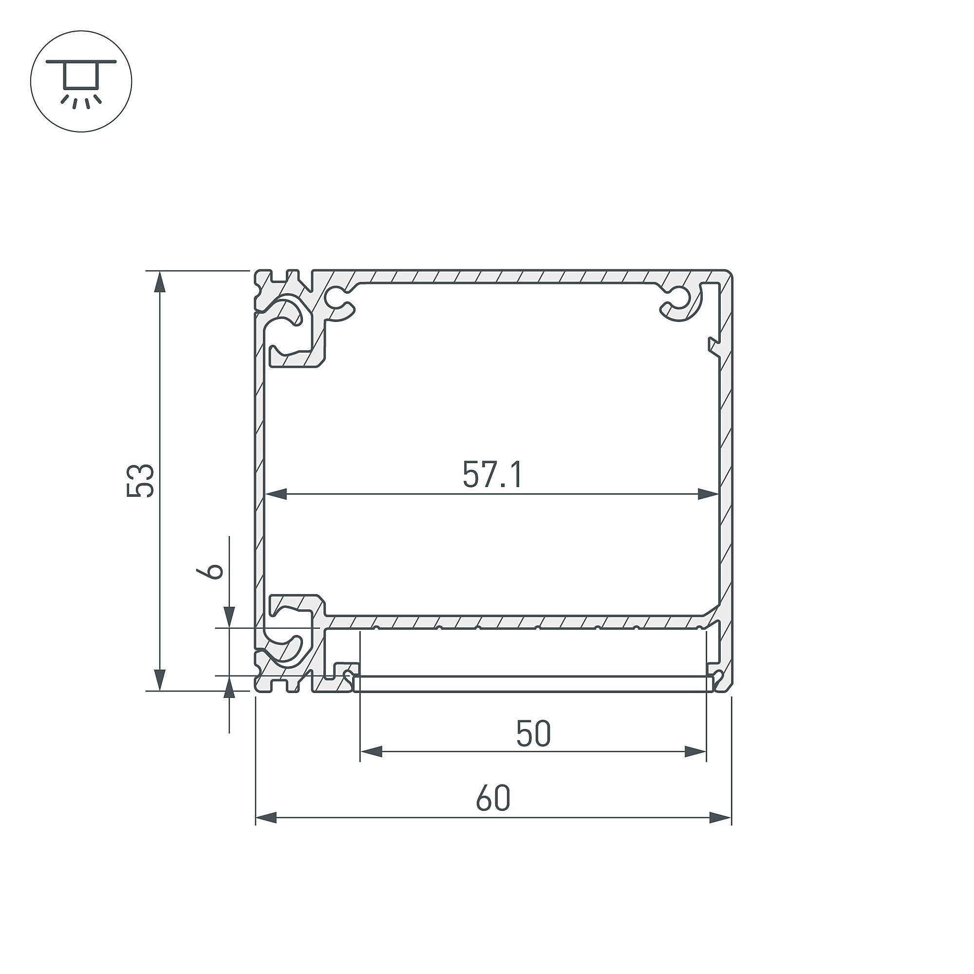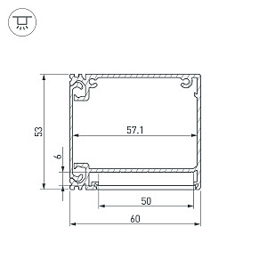 Алюминиевый анодированный профиль для светодиодных лент и линеек, с отсеком для блока питания (размер отсека 50х37мм). Освещение в направлении вдоль основания. Габаритные размеры (L×W×H): 2000x60x53 мм. Ширина площадки для ленты 50 мм. Экраны, заглушки и другие аксессуары приобретаются отдельно. Цена за 1 метр.