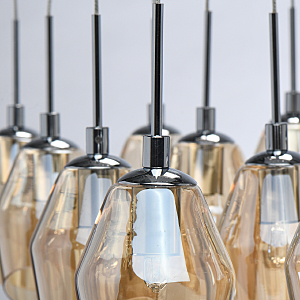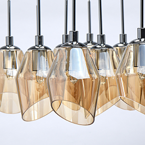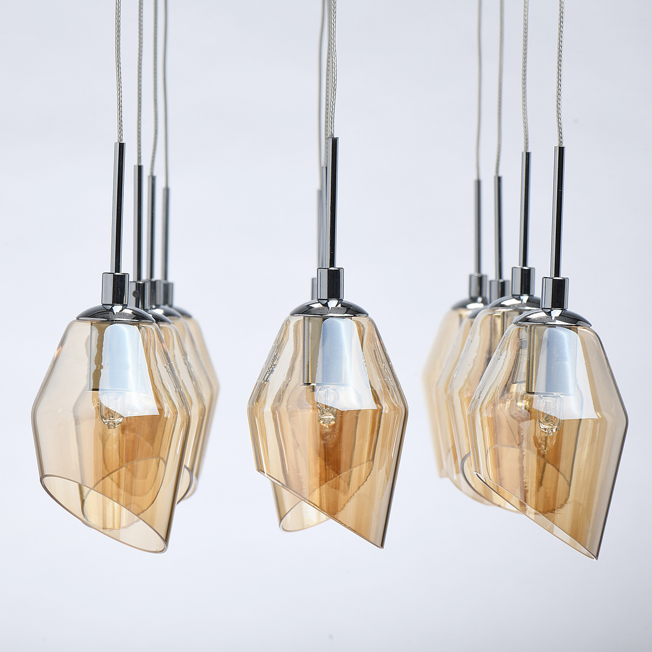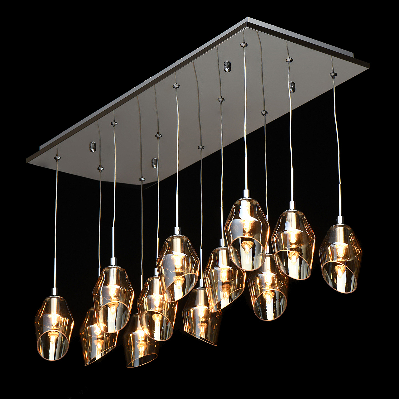Полная семья из бра и подвесов на 1, 5, 8 и 12 ламп.Регулируемая высота до 1,5 м за счет индивидуальных тросов для возможности разноуровневой инсталляции света.Заменяемые источники света G9 компактны и удобны в эксплуатации. Плафоны сложной формы янтарного стекла создают мягкое освещение.