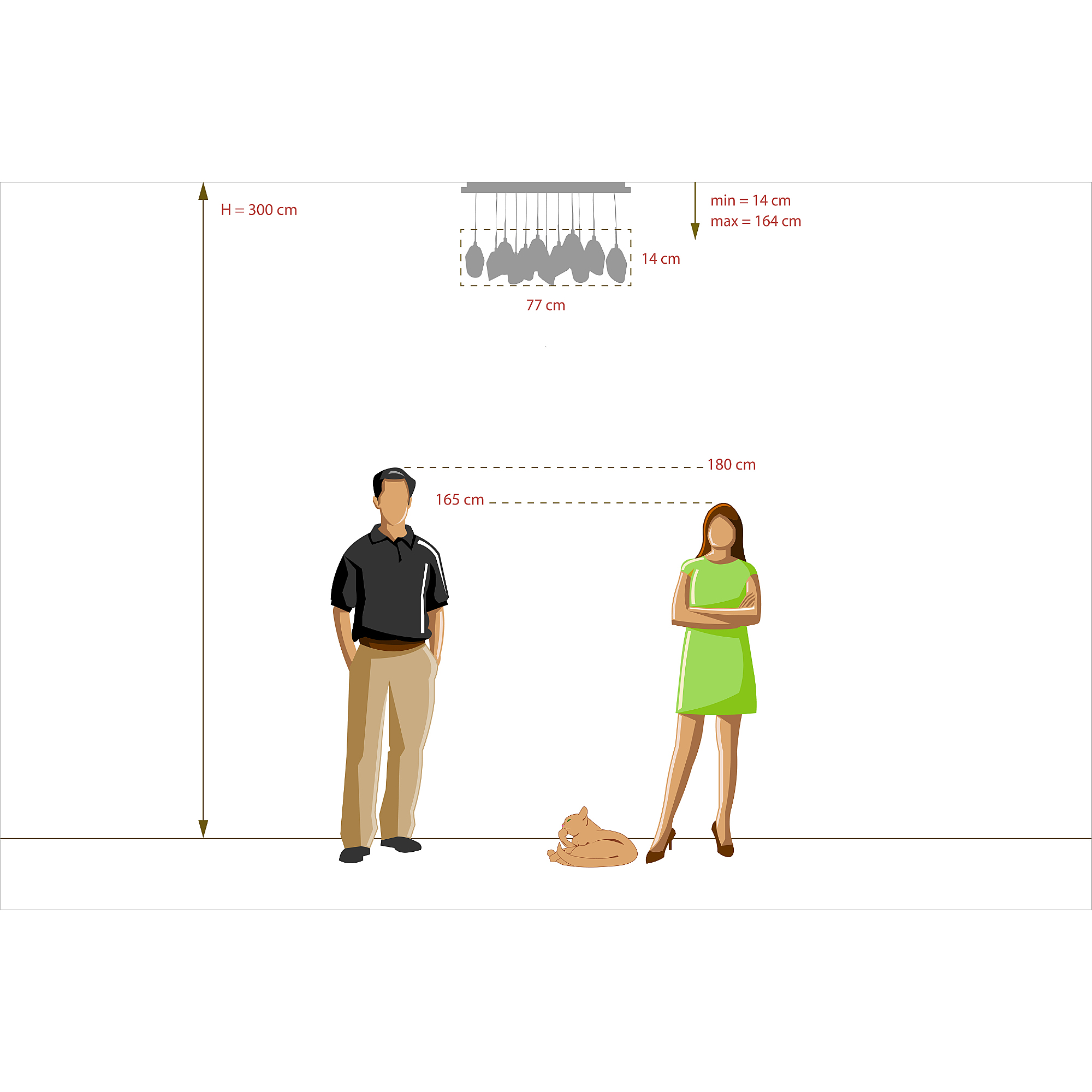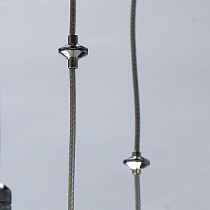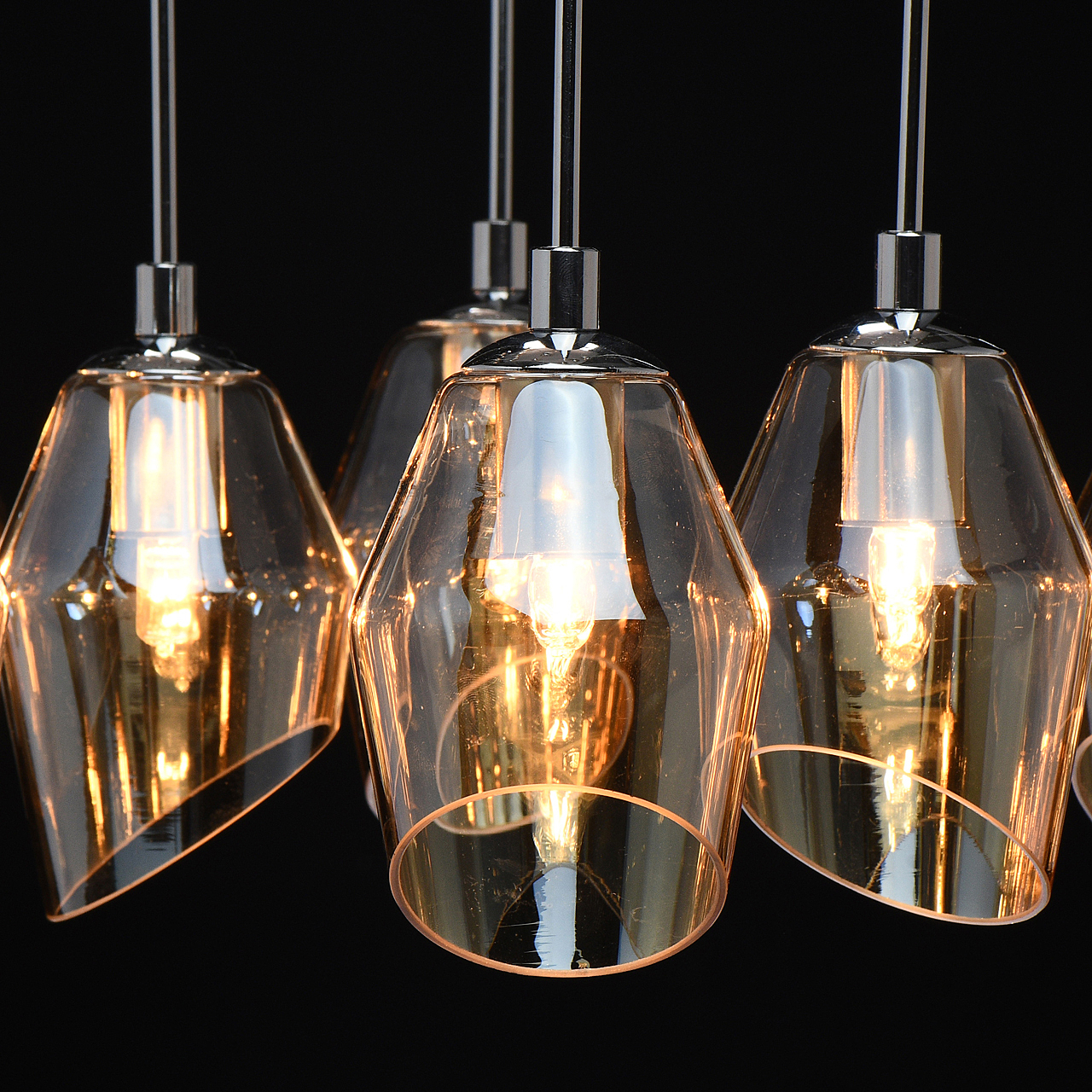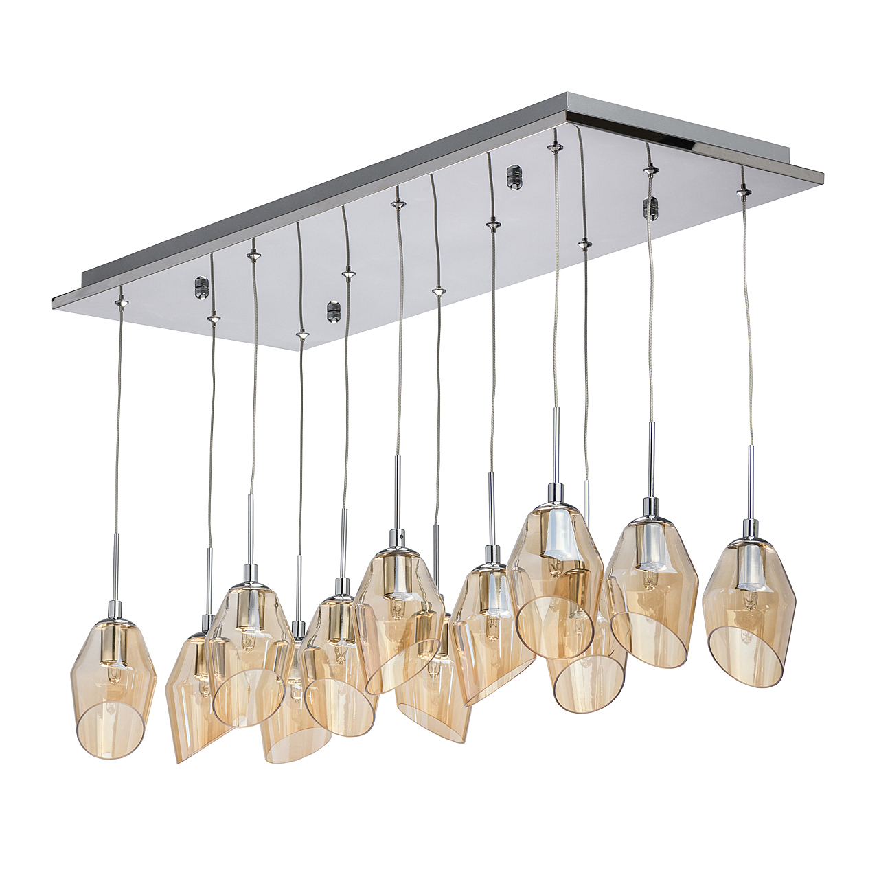 Полная семья из бра и подвесов на 1, 5, 8 и 12 ламп.Регулируемая высота до 1,5 м за счет индивидуальных тросов для возможности разноуровневой инсталляции света.Заменяемые источники света G9 компактны и удобны в эксплуатации. Плафоны сложной формы янтарного стекла создают мягкое освещение.