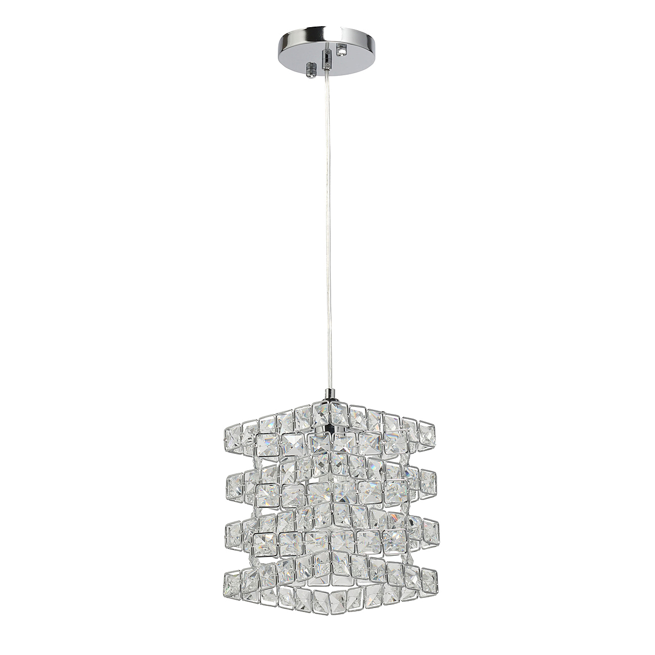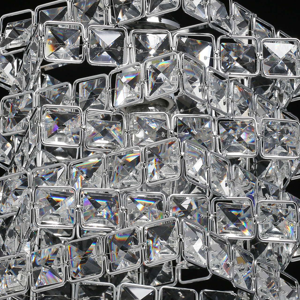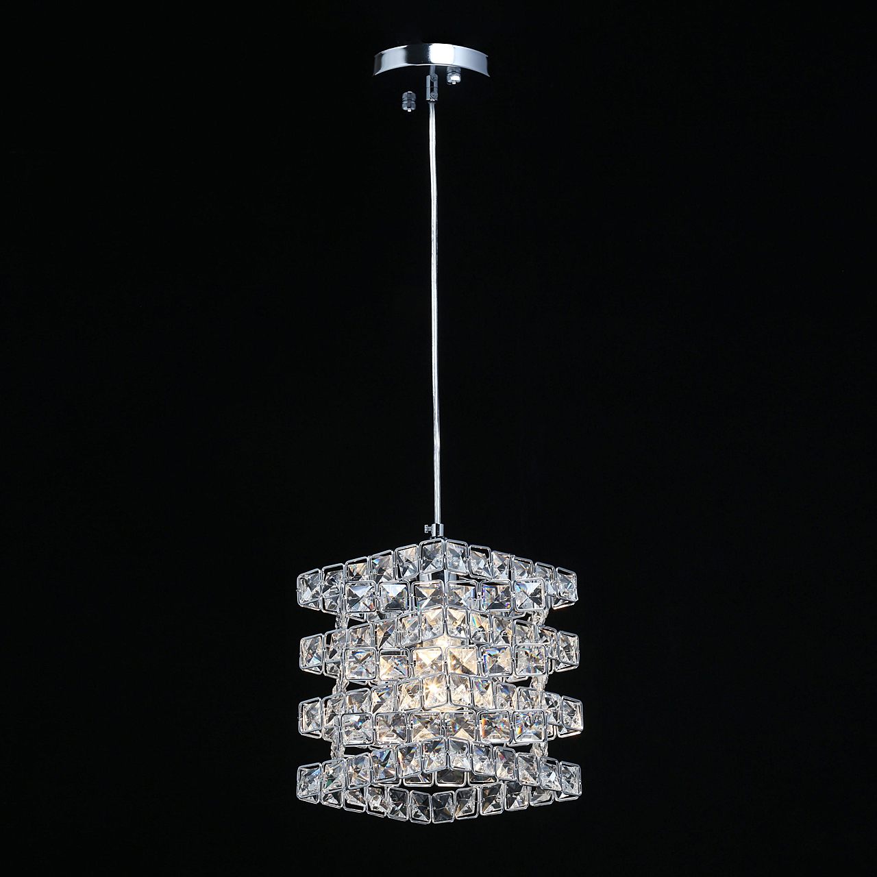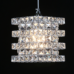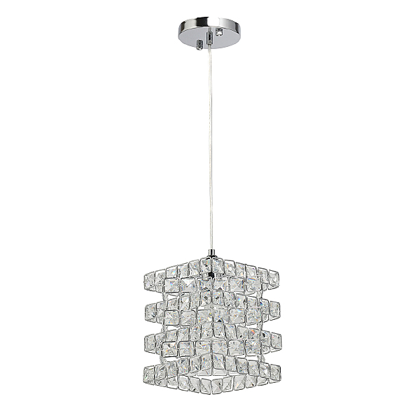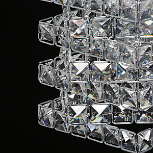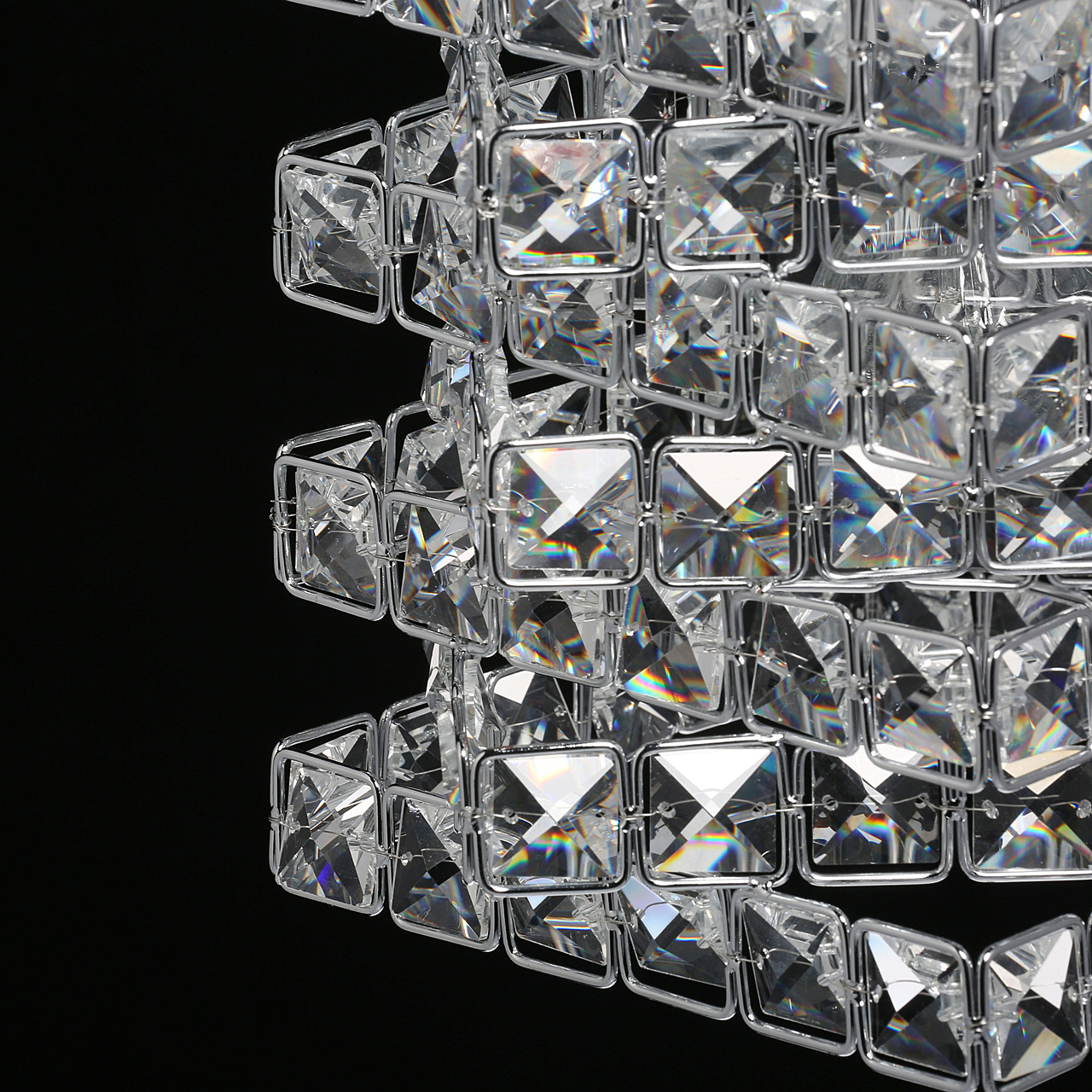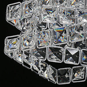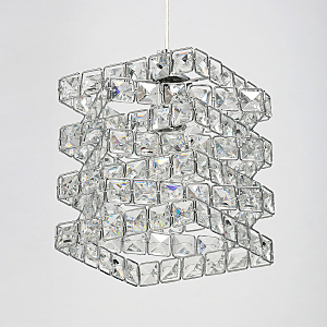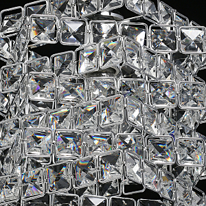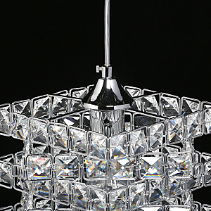 Дизайн-идея подвеса из наборных квадратов.Декор из прозрачного хрусталя квадратной формы обеспечивает эффектную игру света.Универсальный цвет хрома светильника подойдет для интерьеров различной стилистики.Оптимальная длина подвеса 1,2 м удобна для зональной атмосферной подсветки.
