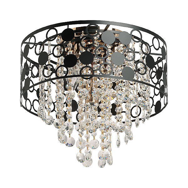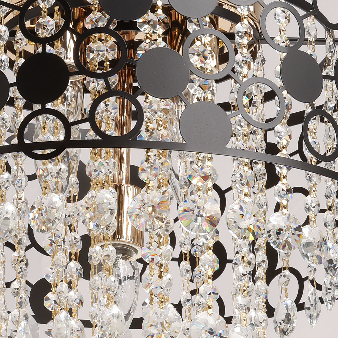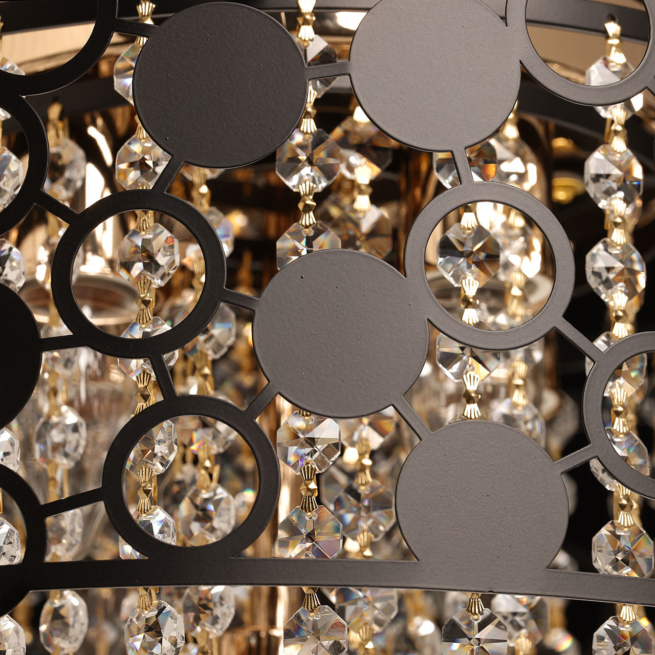 Металлическое основание светильника гальванизировано в цвет золота. Металлический плафон с геометричным орнаментом, выполненным по технологии лазерной резки, окрашен в черный цвет. Люстра декорирована прозрачным хрусталем круглой формы. -