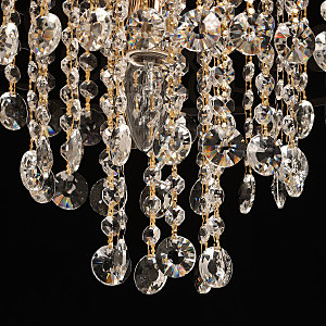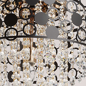 Металлическое основание светильника гальванизировано в цвет золота. Металлический плафон с геометричным орнаментом, выполненным по технологии лазерной резки, окрашен в черный цвет. Люстра декорирована прозрачным хрусталем круглой формы.