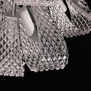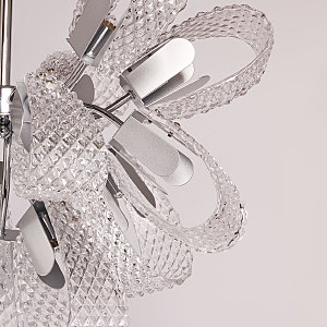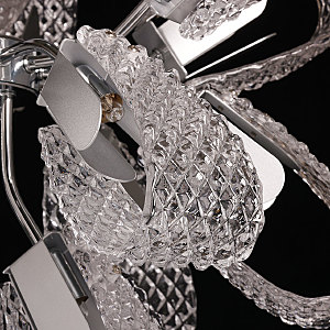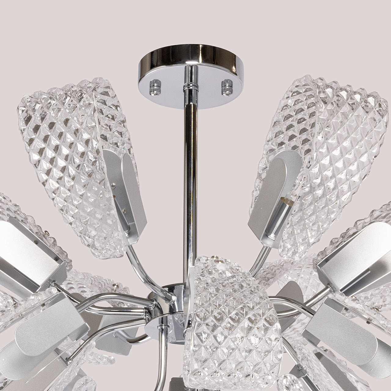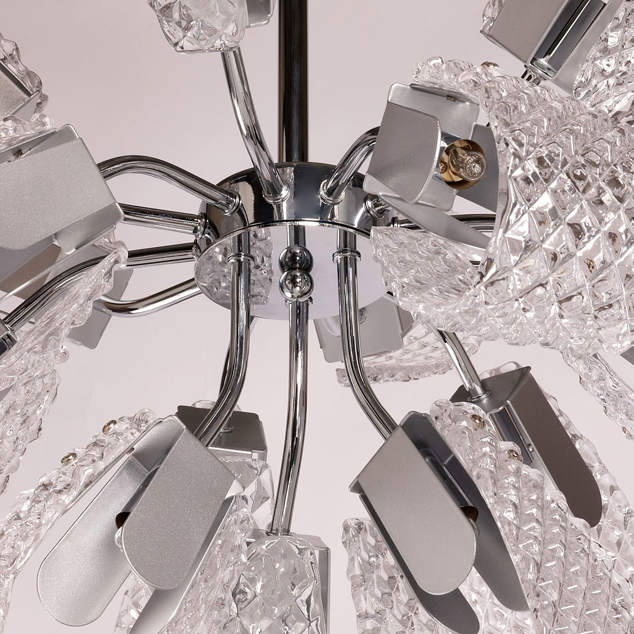 Металлическое основание люстры гальванизировано в цвет хрома. Светильник декорирован оригинальными плафонами из прозрачного фактурного стекла. -