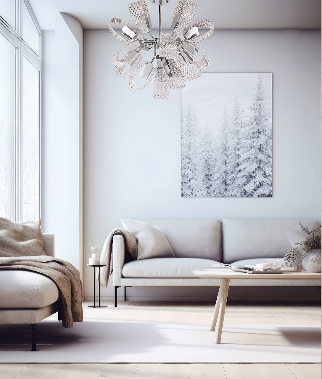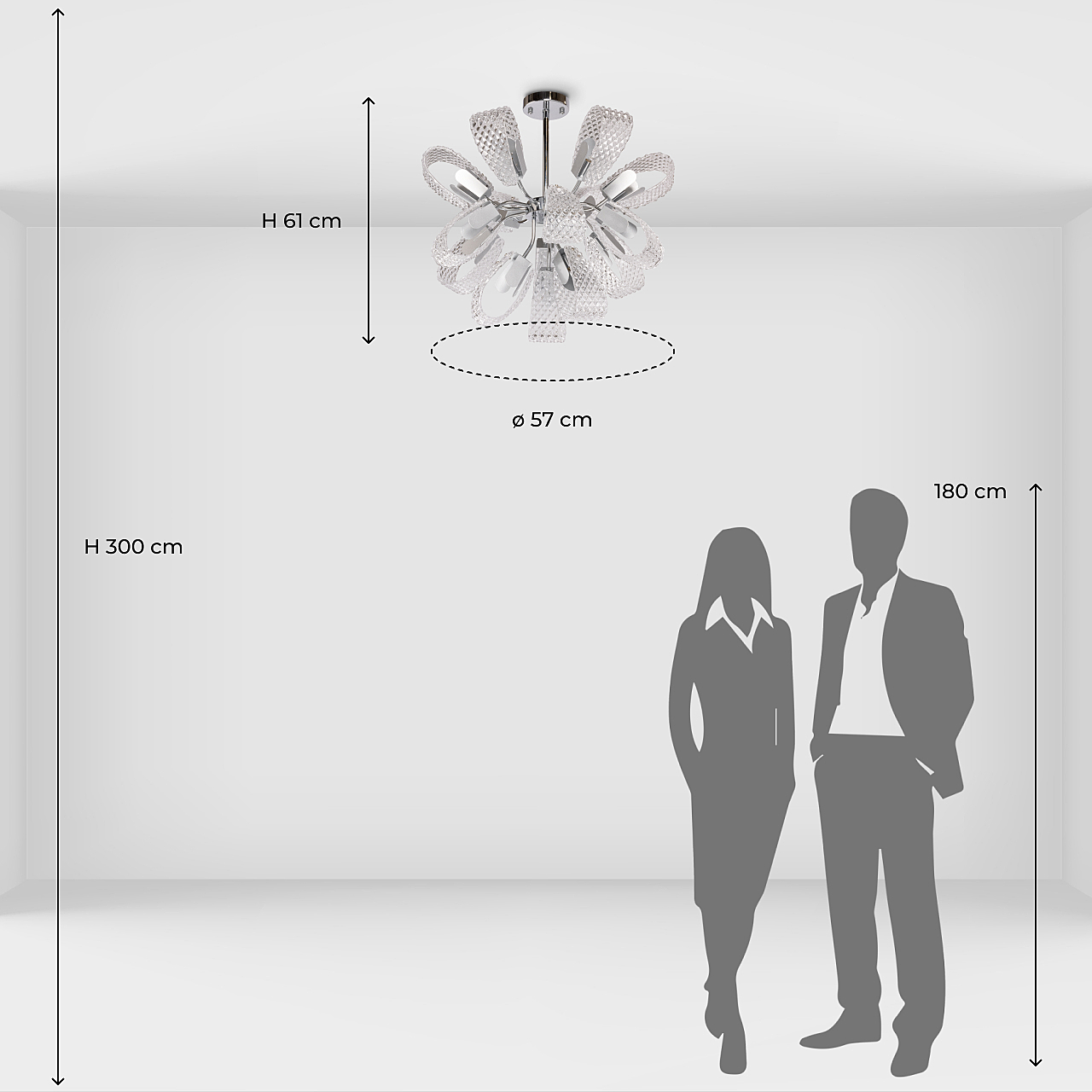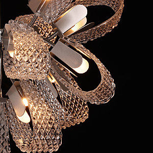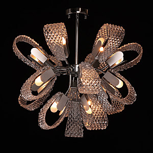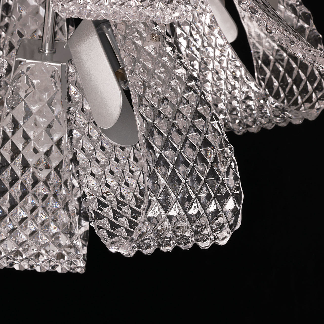 Металлическое основание люстры гальванизировано в цвет хрома. Светильник декорирован оригинальными плафонами из прозрачного фактурного стекла. -