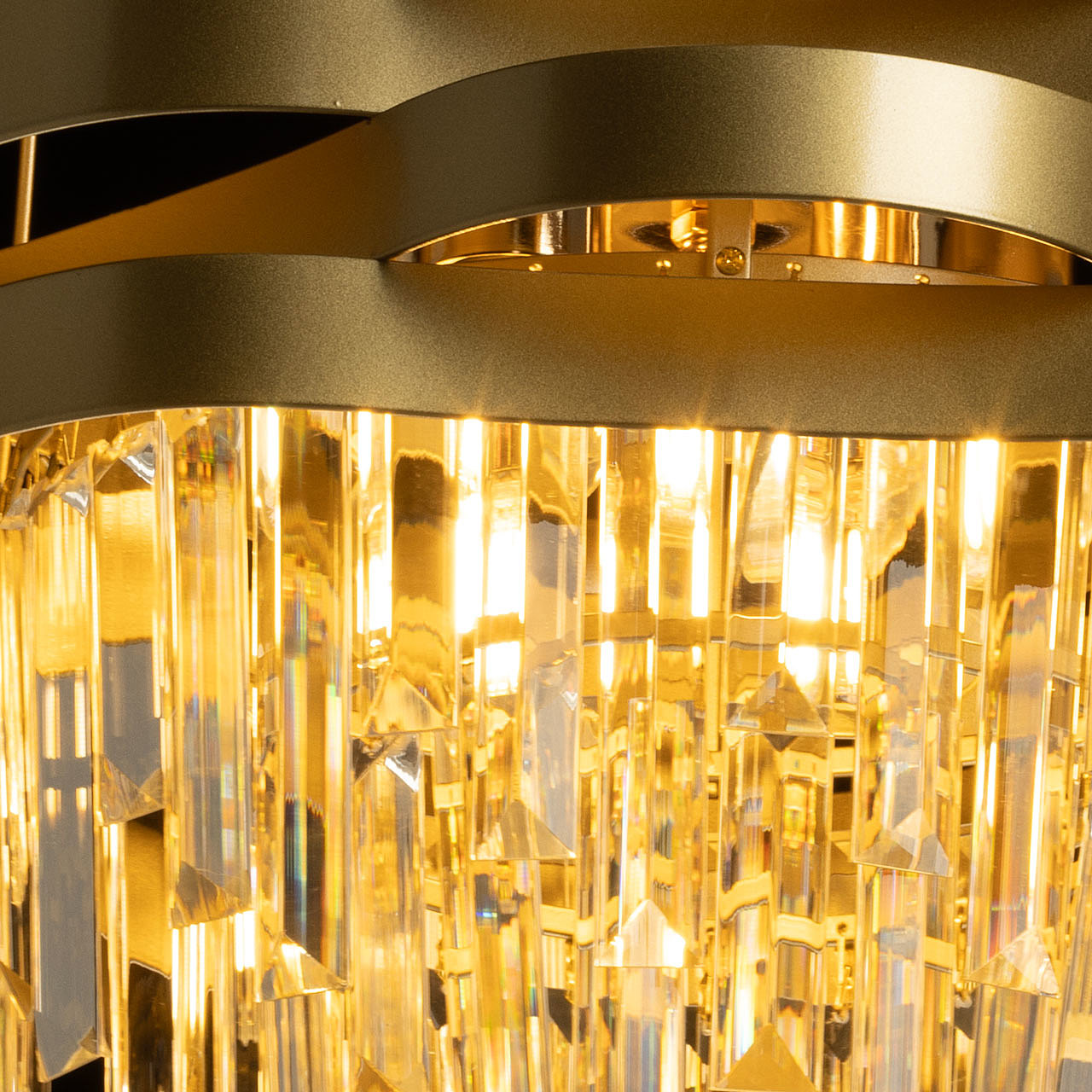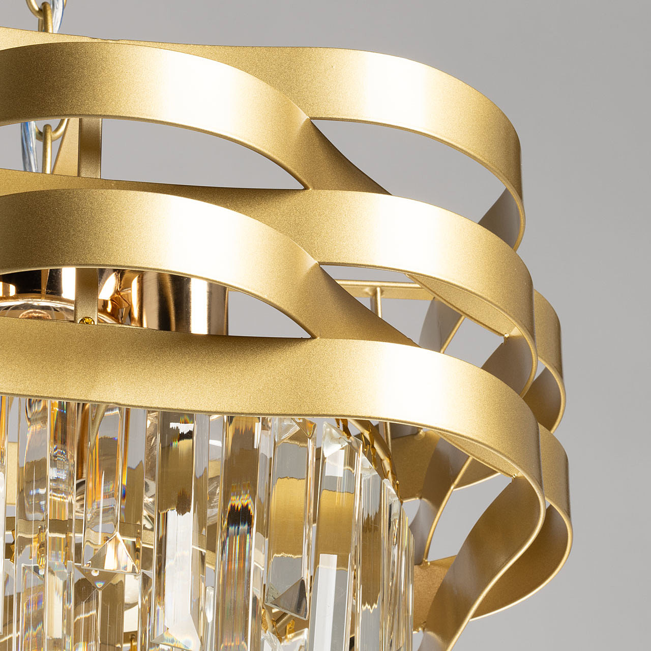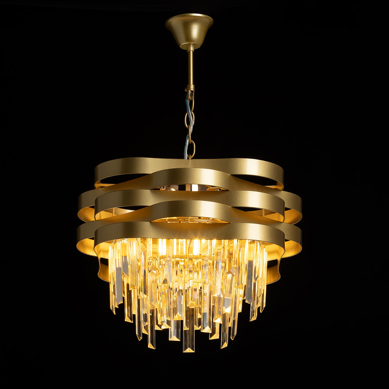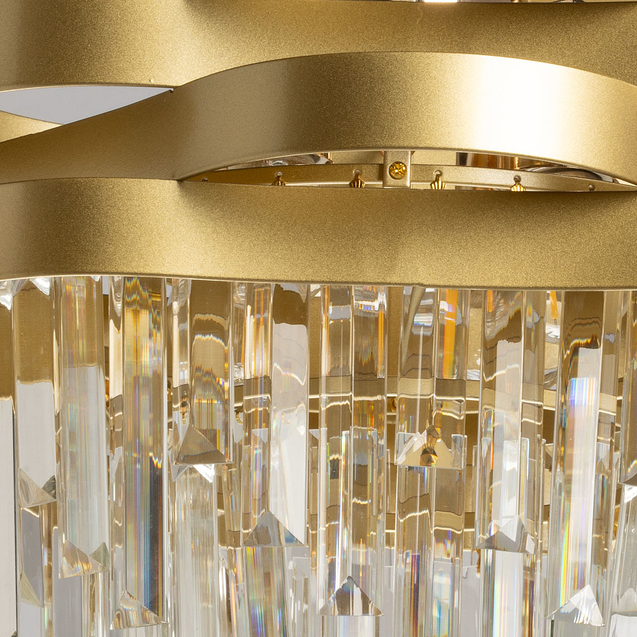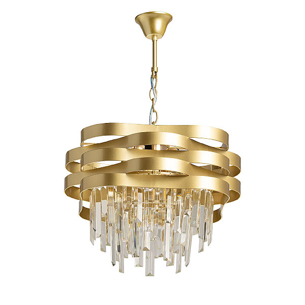 Нежный цвет матового золота гармонирует с оригинальным дизайном плафона и вносит в интерьер романтичность. Металлические ленты, волной окружающие люстру, придают ей легкости и воздушности. Хрустальный декор красиво преломляет свет, создавая радужные. Заменяемые источники света удобны в эксплуатации. Возможность регулировать комфортную высоту.