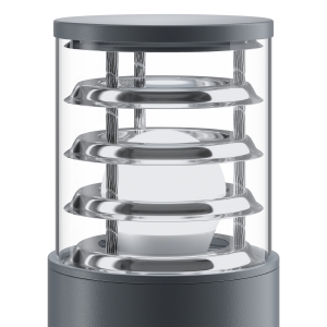 Серия садово-парковых светильников в современном стиле. Установленная в оптической части антибликовая решетка обеспечивает комфорт для наблюдателя и предотвращает световое загрязнение. Использование алюминия в качестве основного материала исключает коррози. Плафон изготовлен из устойчивого к перепадам температур пластика. В качестве источников света используются лампы c цоколем E27.