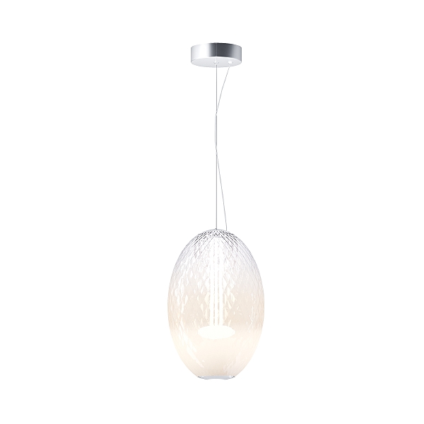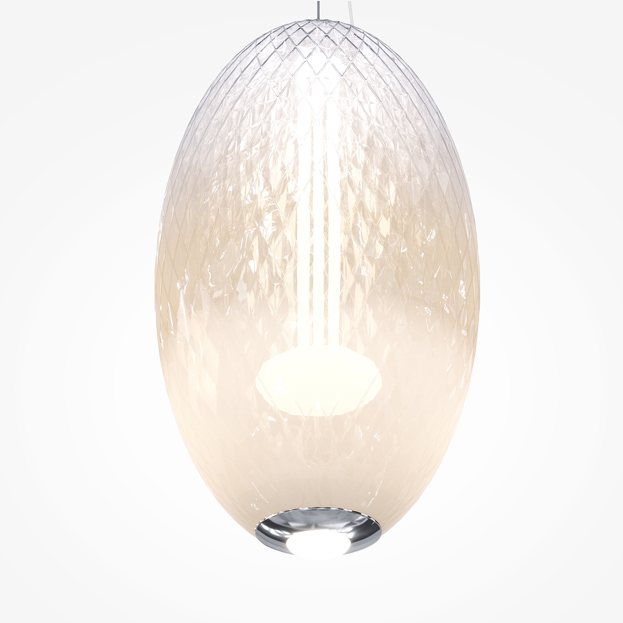 Цвет плафона - градиент от белого к прозрачному. Материал - стекло. Нанесение цвета на стекло осуществлялось по специальной технологии окрашивания в массе, что делает краску устойчивой к повреждениям и царапинам. Оригинальный дизайн в форме кристалла с рельефным орнаментом. LED-источник света. Три формы плафона. Основное освещение со значительным световым потоком. Регулируемая длина провода до 3 метров для высоких потолков. Возможность создания композиций. Хромированные детали для дополнительного акцента.
