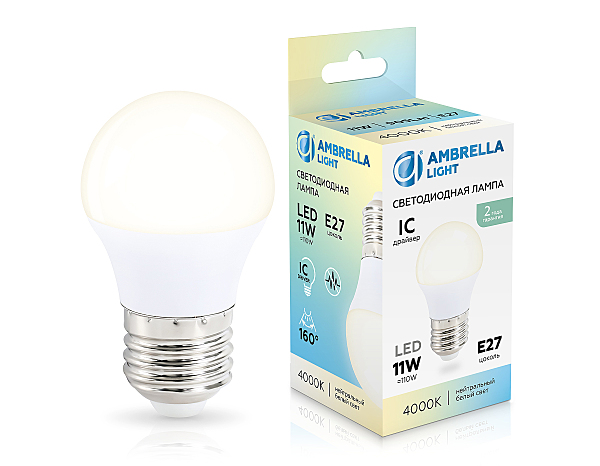 Светодиодная лампа G45, цоколь E27, мощность 11W, IC драйвер (защищает лампу от перепадов напряжения), класс энергоэффективности А, рассеиватель белый матовый, белое свечение 4000K, форма "Шар", 45*80.