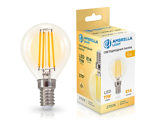 Светодиодная лампа P45 (филамент), цоколь E14, мощность 11W, класс энергоэффективности А, рассеиватель прозрачный, теплое свечение 2700K, форма "Шар", 45*78.