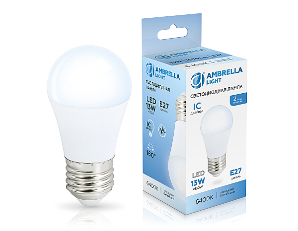 Светодиодная лампа G45, цоколь E27, мощность 13W, IC драйвер (защищает лампу от перепадов напряжения), класс энергоэффективности А, рассеиватель белый матовый, холодное свечение 6400K, форма "Шар", 45*89.