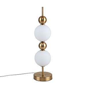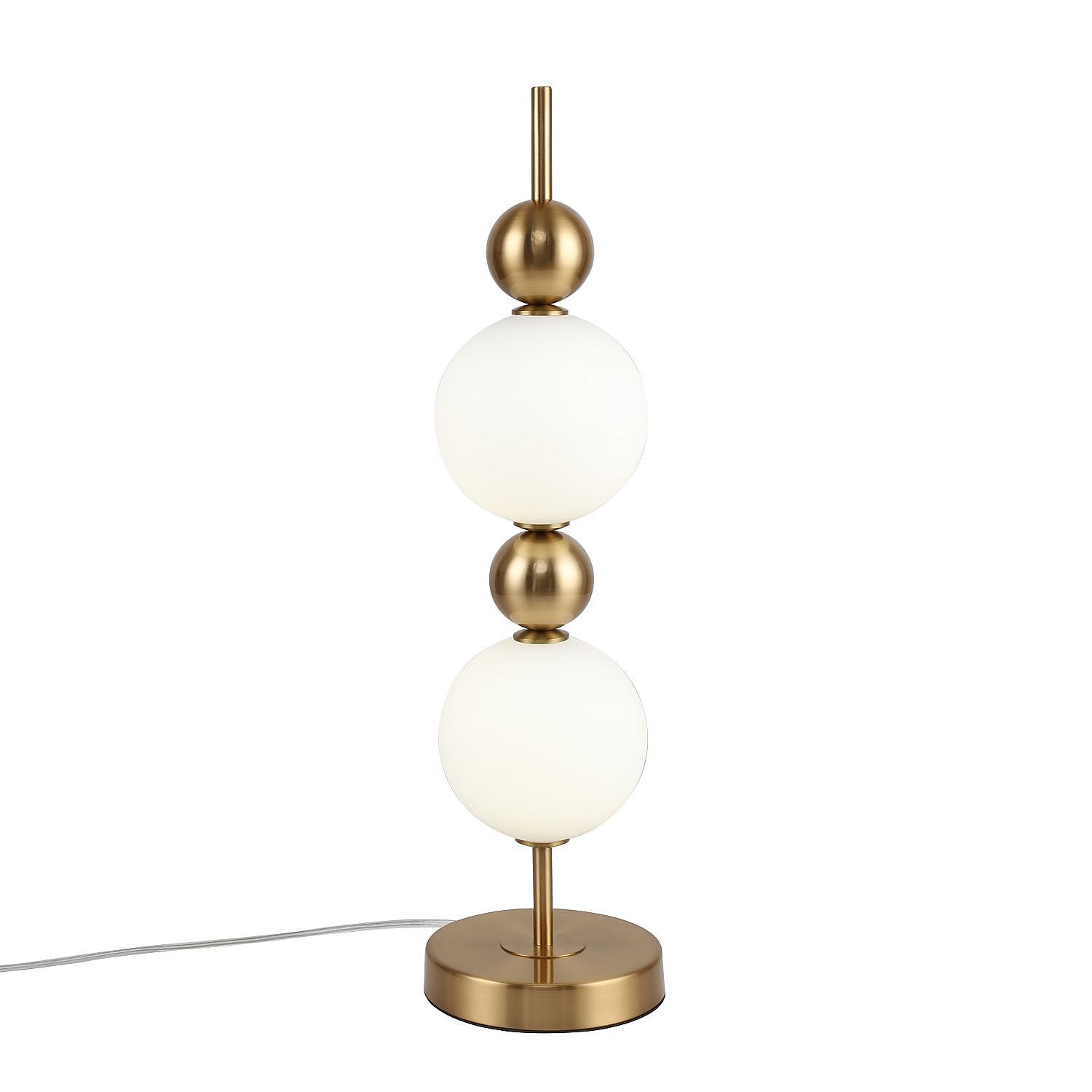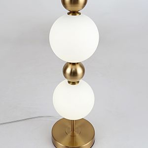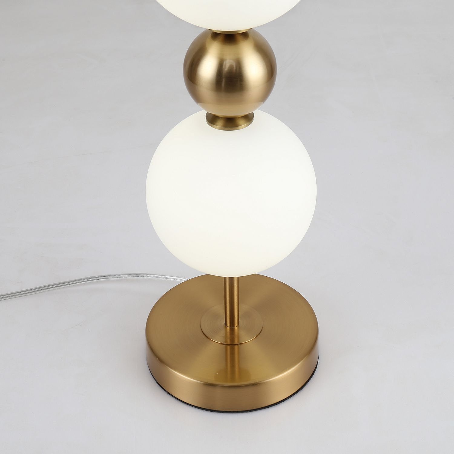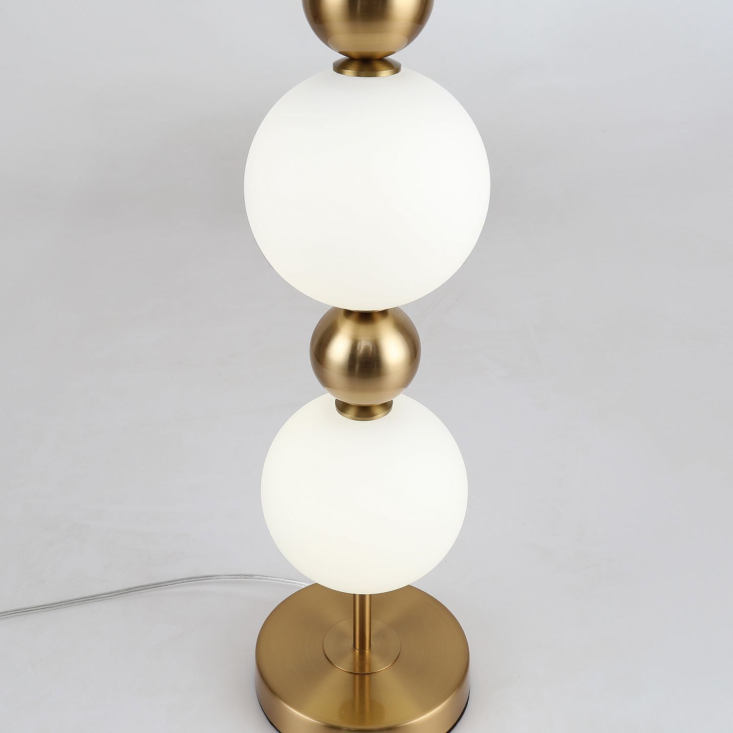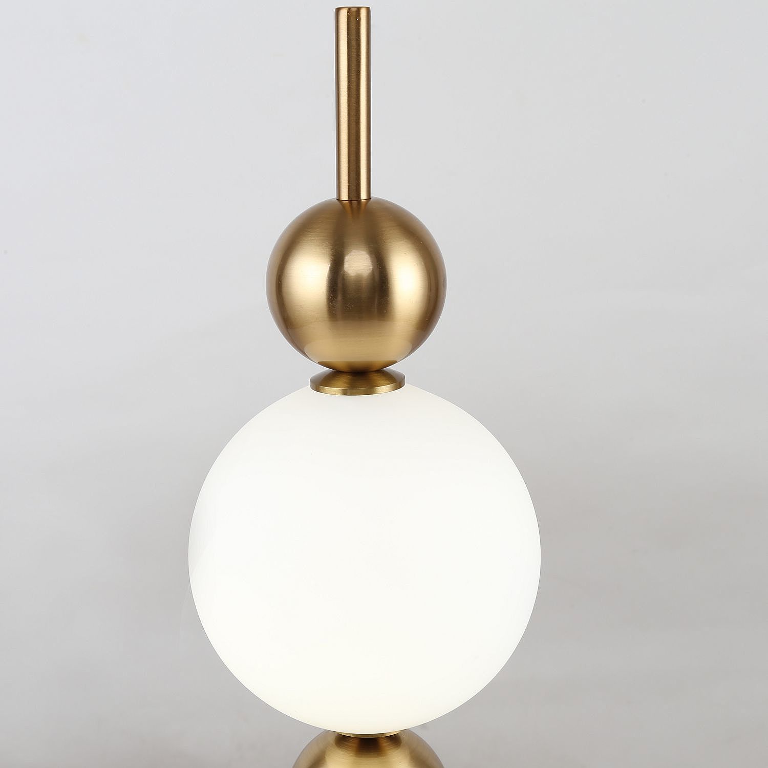 Сочетание плафонов из белого стекла с декоративными шарами и каркасом цвета латуни. Источник света - LED.