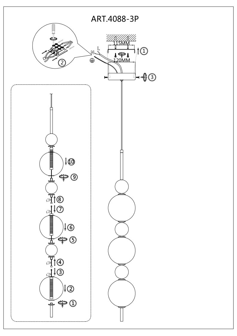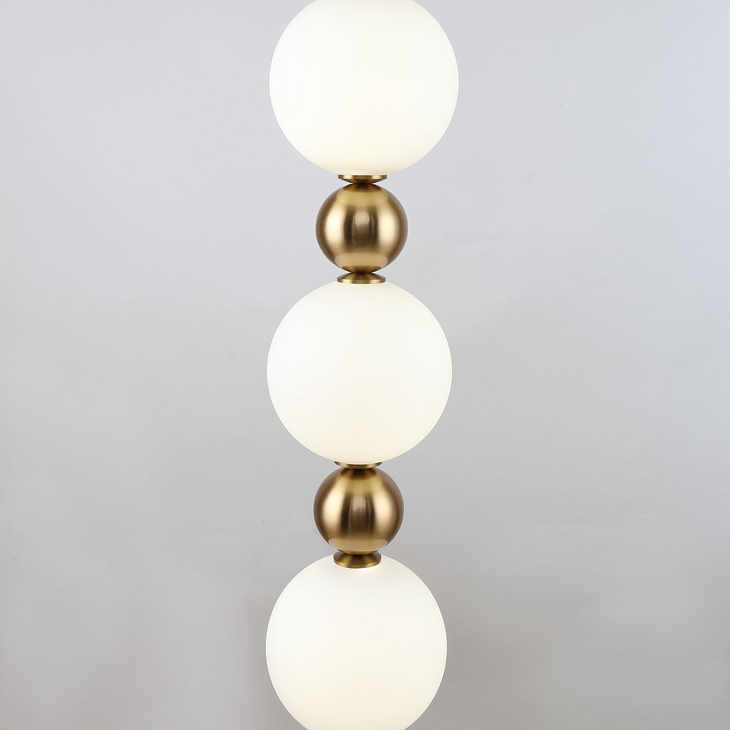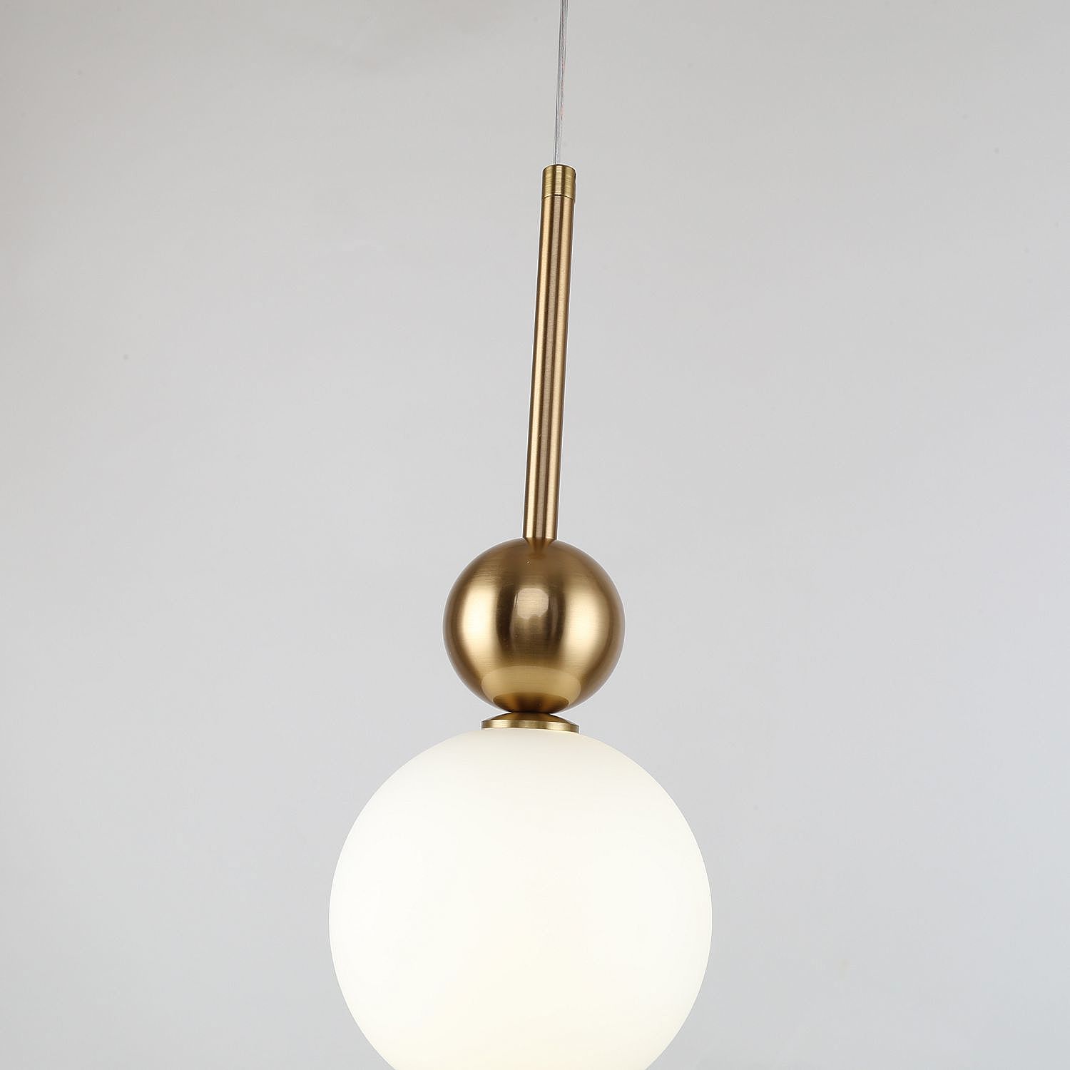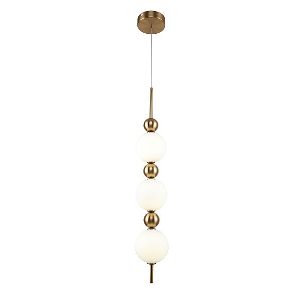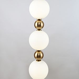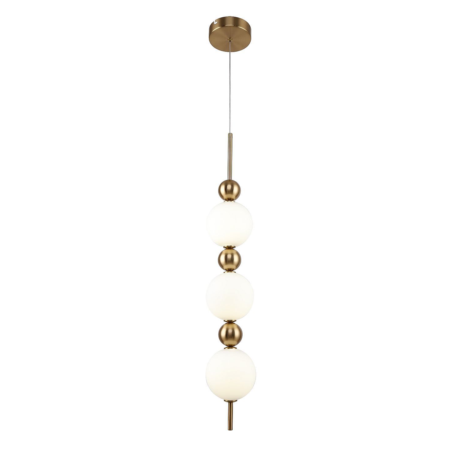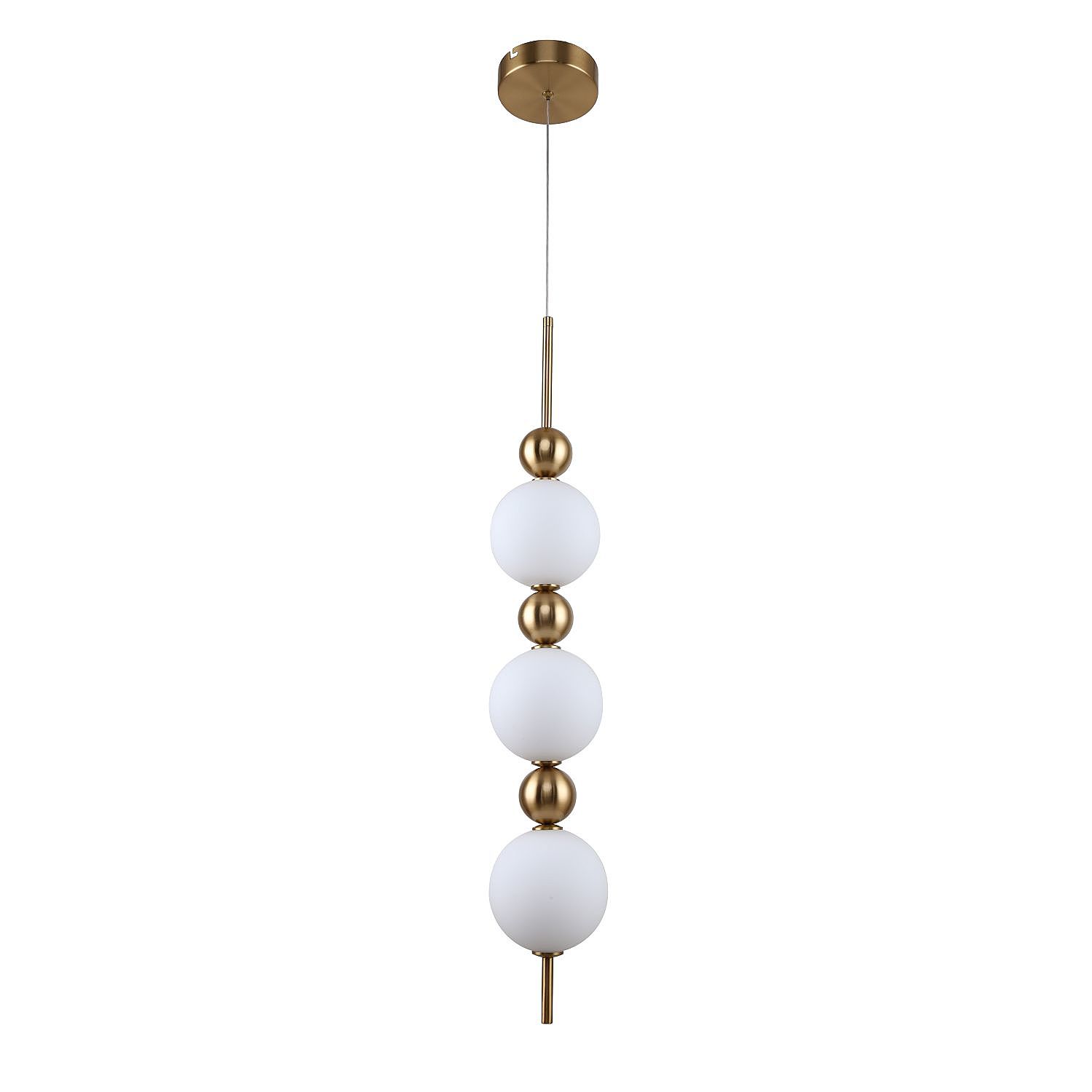 Сочетание плафонов из белого стекла с декоративными шарами и каркасом цвета латуни. Источник света - LED.