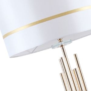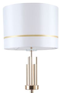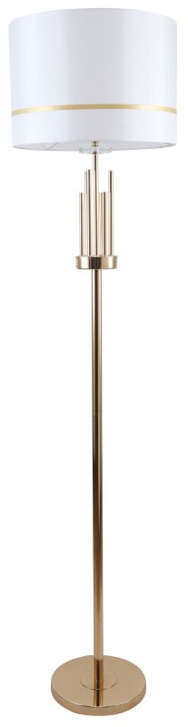 Торшер напольный из коллекции Chart выполнен из металла, гальванизированного в цвет золота, и декорирован железными стержнями в цвет арматуры. Текстильный абажур белого цвета с термостойким акрилом внутри отделан кантом в цвет арматуры. Декоративная розетка выполнена из прозрачного стекла.
