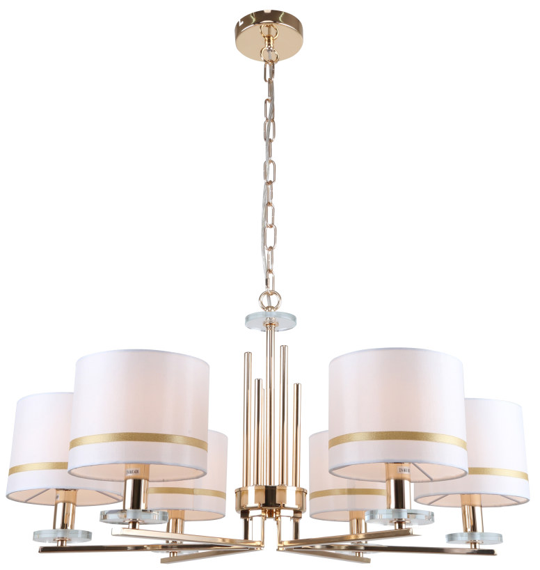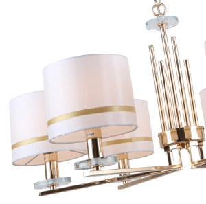 Люстра подвесная из коллекции Chart выполнена из металла, гальванизированного в цвет золота, и декорирована железными стержнями в цвет арматуры. Текстильные абажуры белого цвета с термостойким акрилом внутри отделаны кантом в цвет арматуры. Декоративные розетки выполнены из прозрачного стекла.