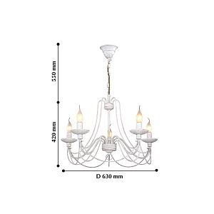 Допускается отличие страны-изготовителя, указанной в характеристиках. Линии производства могут находиться в нескольких государствах. Это не влияет на качество изготовления товара: все заводы данного бренда работают по общим стандартам, а готовые изделия проходят соответствующий контроль.Германия Коллекция Chateau ЦветЦвет арматуры Белый, золотая патина Цвет Белый Материал арматуры Металл РазмерыВысота (мм) 970 Диаметр (мм) 630 Высота минимальная (мм) 420 Ширина (мм) 630 ЭлектрикаКоличество ламп (шт) 5 Цоколь E14 Мощность лампы (Вт) 60 Напряжение (В) 220 Дополнительная информацияСпособ крепления Крюк Вес (Кг) 2,8 Тип подвеса На цепи -
