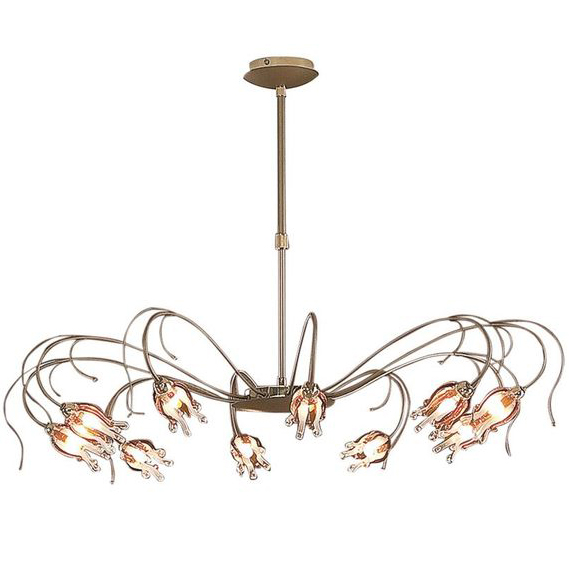 Люстра потолочная металлическая, плафоны из стекла. Способ крепления: монтажная пластина прикручивается к потолку. Особенности светильника: Встроенный лифт позволяет регулировать высоту светильника по своему усмотрению. Плафоны выполнены в форме бутонов, обеспечивают мягкое рассеивание света, приятное для глаз, светильник подойдет для просторных помещений с высокими потолками. Данная модель светильника станет оригинальным стилистическим дополнением современного интерьера, создаст атмосферу уюта в помещении. Подходит для освещения 20 кв. м. Галогеновые лампочки, схема сборки и подключения в комплекте.