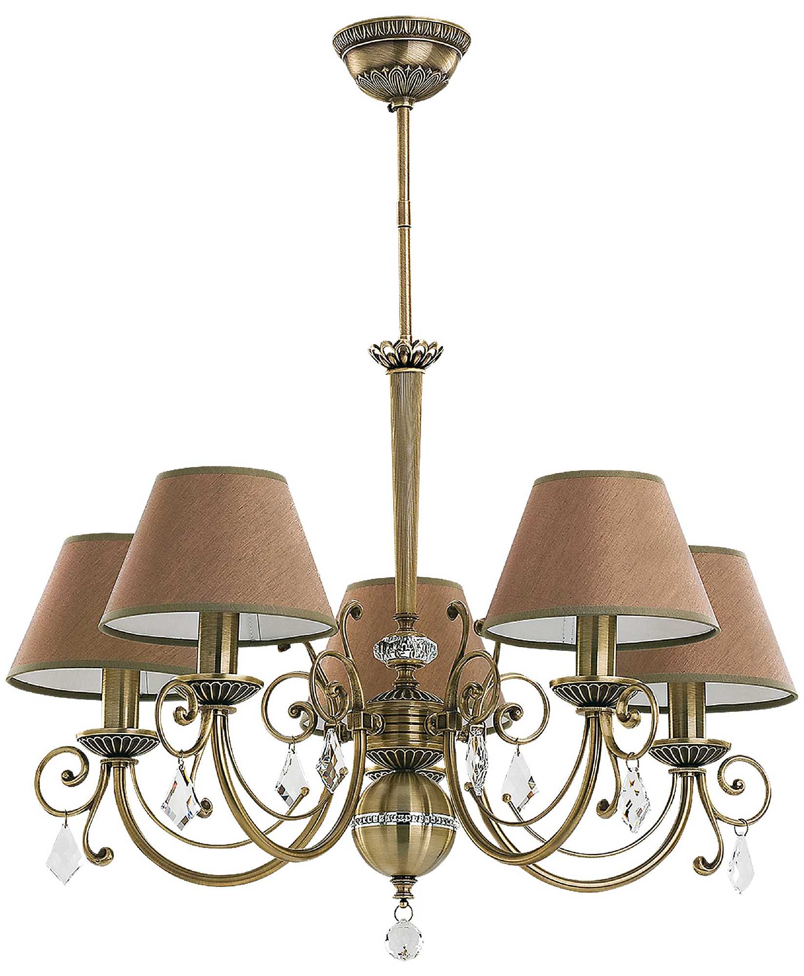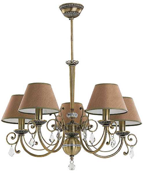 COC-ZW-5 (P/A) - элегантная пятирожковая люстра в патинированной отделке. Абажуры создают мягкое освещение, а форма светильника придаёт пространству ритм и выразительность. Прекрасна для симметричной планировки в столовых и залах.