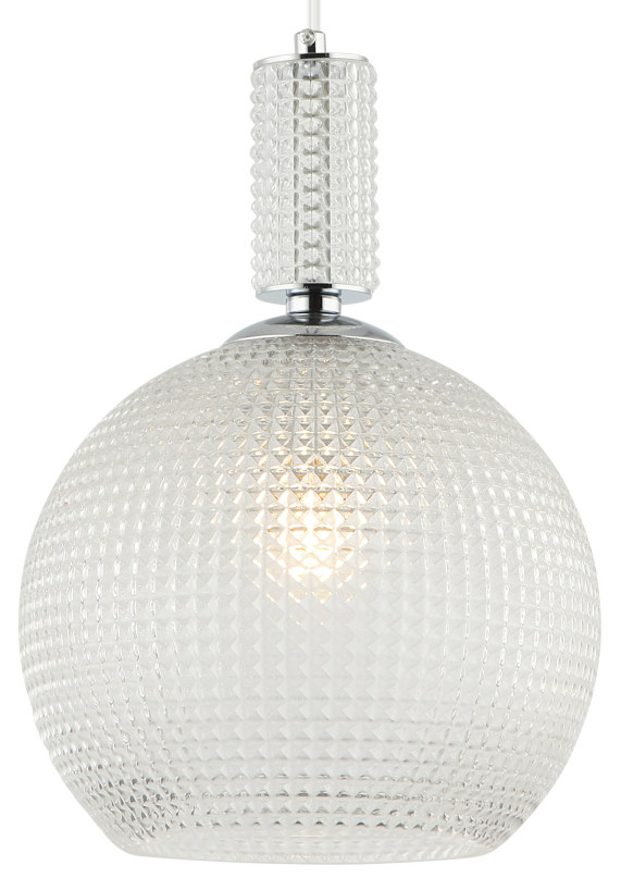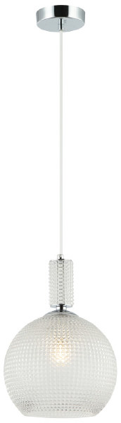 Светильник подвесной из коллекции Coloure выполнен из металла, гальванизированного в цвет хрома, и декорирован плафоном из прозрачного фактурного стекла.