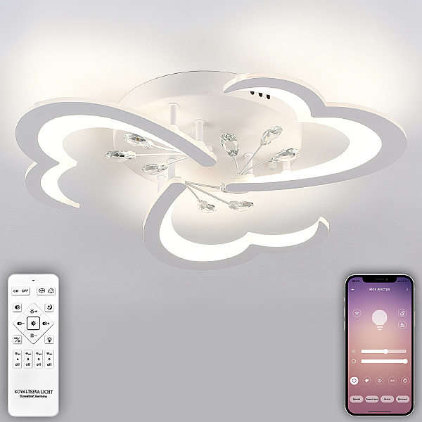 Светодиодный светильник с дистанционным управлением через пульт ДУ, смартфон, планшет. Лицевую часть составляют равноудалённые друг от друга рожки с симметричным дизайнерским узором, выполненные из акрила и располагающиеся на двух уровнях. Это обеспечивает отличное и равномерное рассеивание света. Стеклянные элементы эффектно преломляют свет, дополняя данную модель. Дизайн люстры выполнен в современном стиле в золотом цвете и отлично подойдёт в любой интерьер. Люстра имеет тёплый, естественный и холодный свет с регулировкой температуры свечения. Обладает плавной настройкой яркости в диапазоне от 10% до 100%. Имеется режим ночника и таймер отключения. Кроме того, от стандартного выключателя люстра имеет 4 режима свечения. Данные функции делают светильник оптимальным в процессе использования. Общая мощность 80W со световым потоком 6000 lm позволяет осветить до 14 кв.м. Он прост в сборке, установке и экономичен в обслуживании. Светодиоды легко заменимы в случае перегорания. Люстра подойдёт для всех видов потолков. Цветовая температура настраивается от 3000 до 6500 K. Степень защиты 20 IP.