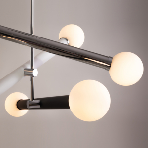 Арматура - металлическая, цвет - хром, золото. Часть конструкции спрятана в стеклянные трубки в цвет арматуры, соединяющие белые матовые плафоны в форме классической лампочки. Ассиметричный дизайн, разное направление света. Источник света - лампа с цоколем G9.