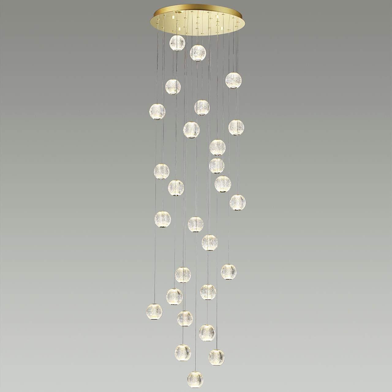 Великолепная светодиодная линия Crystal поражает изяществом, лаконичностью и многообразием модельного ряда. Люстра для помещений с высокими потолками, лестничных пролетов в коттеджах и залов со вторым светом в 2-х цветах арматуры - золото и хром прекрасно украсит интерьер в различных стилях - от неоклассики до хайтека. Множество акриловых шариков, имитирующих хрустальную резную фактуру, создадут непередаваемую игру света и переливов. Максимальная длина подвеса 2,5 м. Общую длину люстры и расположение подвесов можно регулировать самостоятельно. Модель имеет удобную систему установки подвесов в потолочную базу.