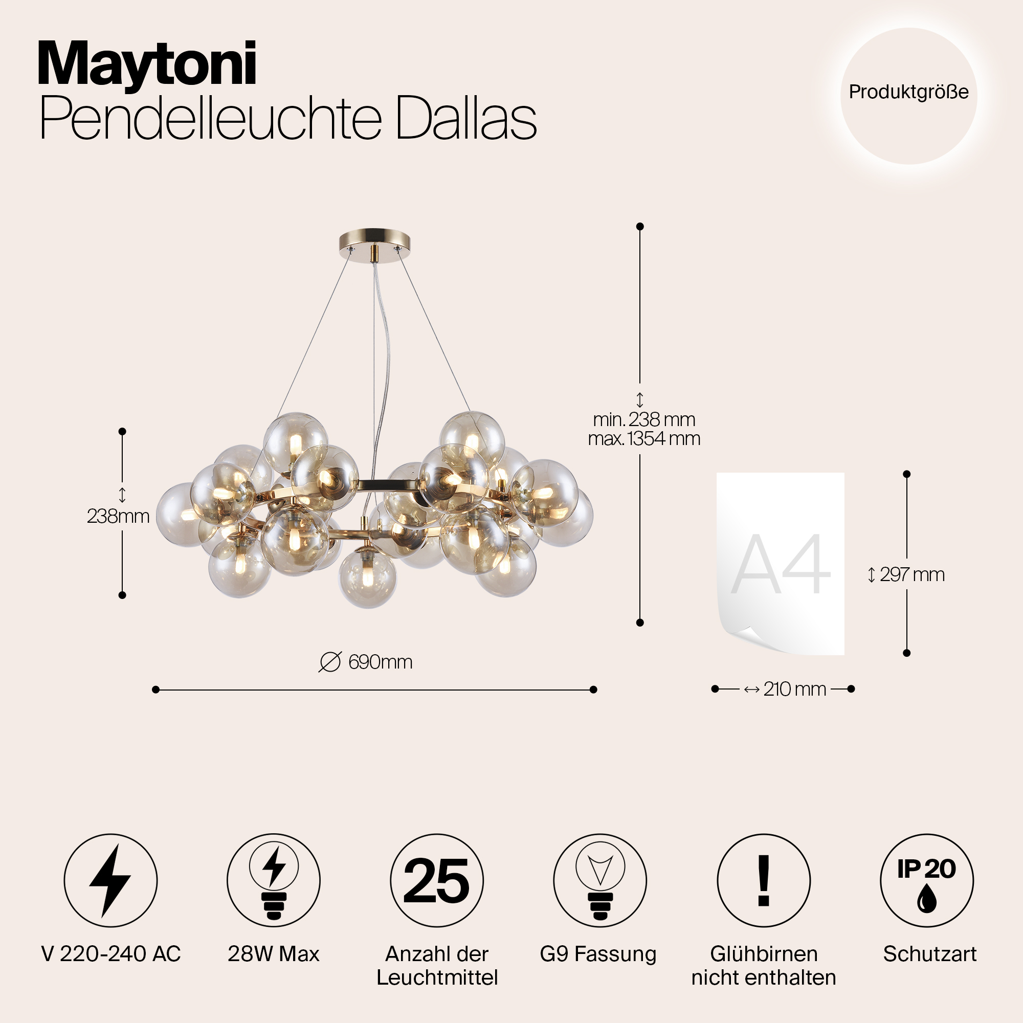 Допускается отличие страны-изготовителя, указанной в характеристиках. Линии производства могут находиться в нескольких государствах. Это не влияет на качество изготовления товара: все заводы данного бренда работают по общим стандартам, а готовые изделия проходят соответствующий контроль.Германия Коллекция Dallas ЦветЦвет арматуры Золото Цвет Золото Материал арматуры Металл Цвет плафона янтарный Материал плафона Стекло РазмерыВысота (мм) 1438 Диаметр (мм) 690 Высота минимальная (мм) 238 Ширина (мм) 690 ЭлектрикаКоличество ламп (шт) 25 Цоколь G9 Мощность лампы (Вт) 28 Дополнительная информацияВес (Кг) 4,02 Тип подвеса На тросах -
