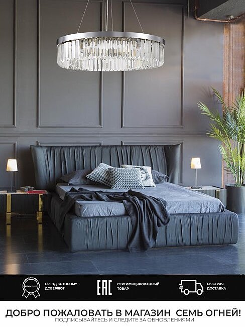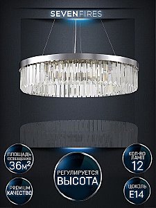 ПРЕИМУЩЕСТВА. Гальваническое покрытие цвета Хром. Хрусталь непревзойденного качества ASTREA. Хорошие осветительные характеристики благодаря многогранности хрусталя. ПРИМЕНЕНИЕ. Люстра подвесная предназначена для основного освещения помещений-. гостиная,зал,спальня,прихожая,детская,кухня. Можно регулировать высоту люстры изменением длины провода. Используемые материалы-металл,хрусталь. Источник света-лампы накаливания мощностью до 40Вт,светодиодные лампы мощностью до 12Вт. Крепление накладным способом монтажной планки шурупами. Удобный крепеж подойдет под все виды потолков-бетон,гипсокартон,натяжные и деревянные потолки. Люстра подвесная изготовлена из высококачественных материалов и является безопасной для человека и окружающей среды.. Семь Огней создает продукт от эскиза до готового шедевра. Над созданием светильников трудятся одни из лучших дизайнеров и конструкторов. Наша компания предъявляет высокие требования к производимой продукции, что подтверждено сертификатами качества.