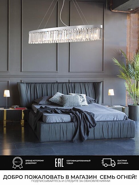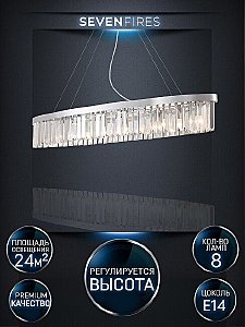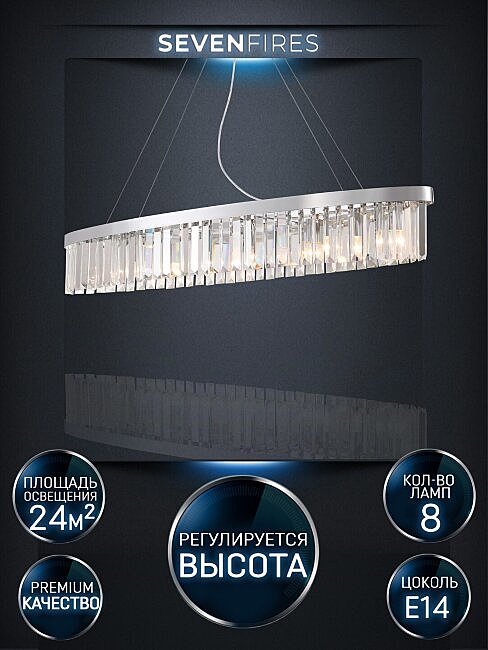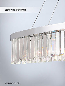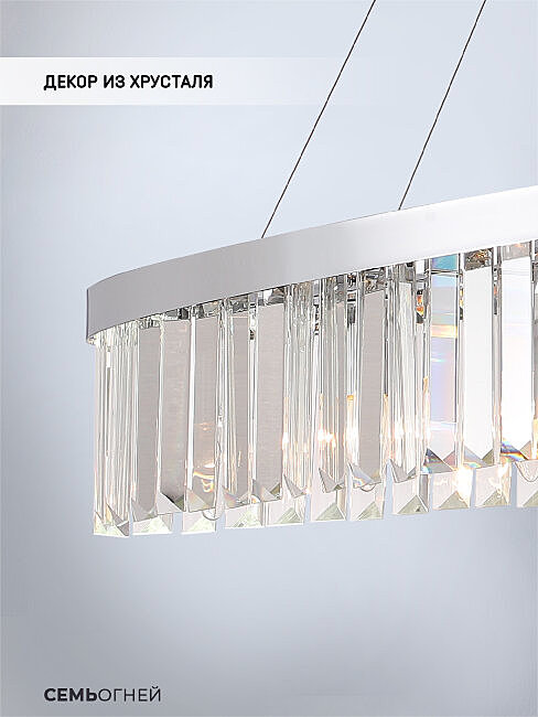 ПРЕИМУЩЕСТВА. Гальваническое покрытие цвета Хром. Хрусталь непревзойденного качества ASTREA. Хорошие осветительные характеристики благодаря многогранности хрусталя. ПРИМЕНЕНИЕ. Люстра подвесная предназначена для основного освещения помещений-. гостиная,зал,спальня,прихожая,детская,кухня. Можно регулировать высоту люстры изменением длины провода. Используемые материалы-металл,хрусталь. Источник света-лампы накаливания мощностью до 40Вт,светодиодные лампы мощностью до 12Вт. Крепление накладным способом монтажной планки шурупами. Удобный крепеж подойдет под все виды потолков-бетон,гипсокартон,натяжные и деревянные потолки. Люстра подвесная изготовлена из высококачественных материалов и является безопасной для человека и окружающей среды.. Семь Огней создает продукт от эскиза до готового шедевра. Над созданием светильников трудятся одни из лучших дизайнеров и конструкторов. Наша компания предъявляет высокие требования к производимой продукции, что подтверждено сертификатами качества.