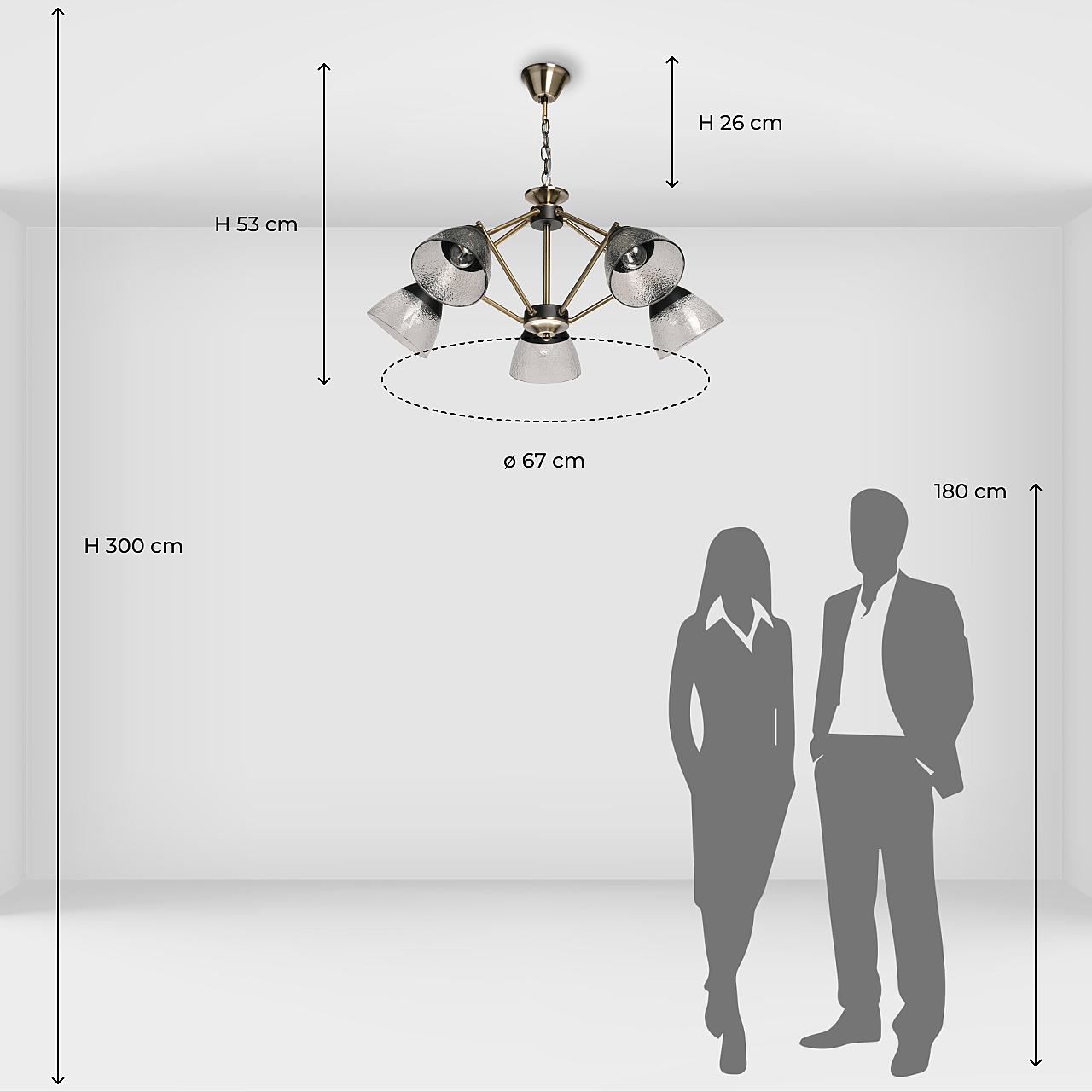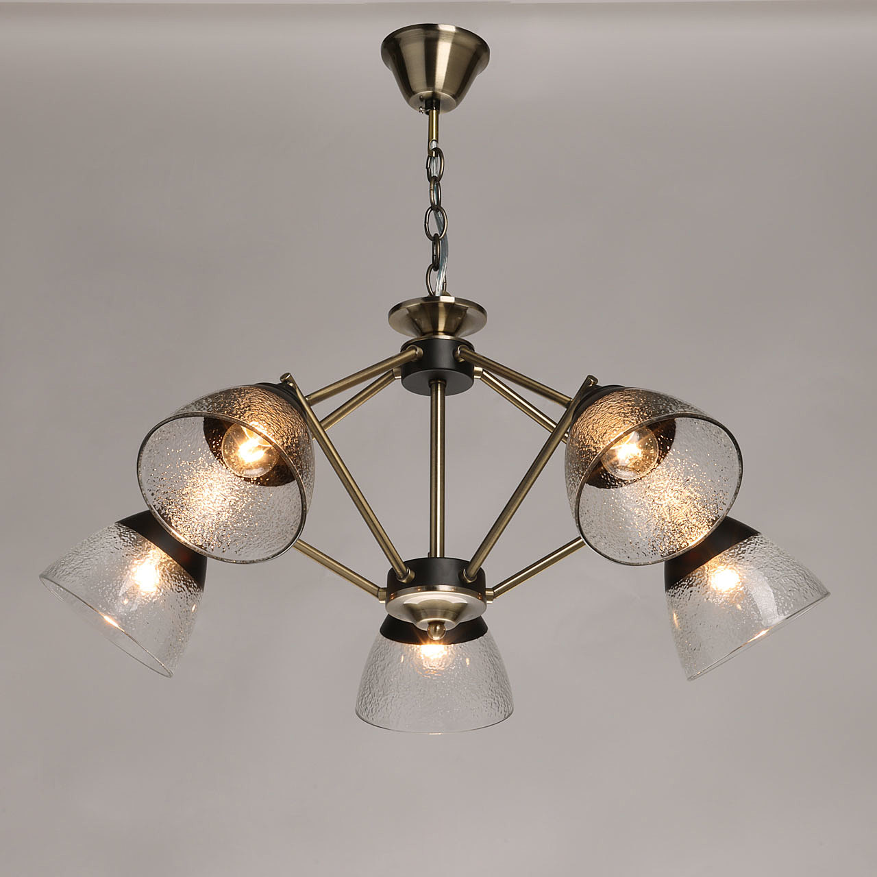 Металлическое основание подвесной люстры гальванизировано в цвет латуни. Отдельные элементы основания окрашены в черный цвет. Плафоны отлиты из прозрачного фактурного стекла. У основания плафоны окрашены в черный цвет.