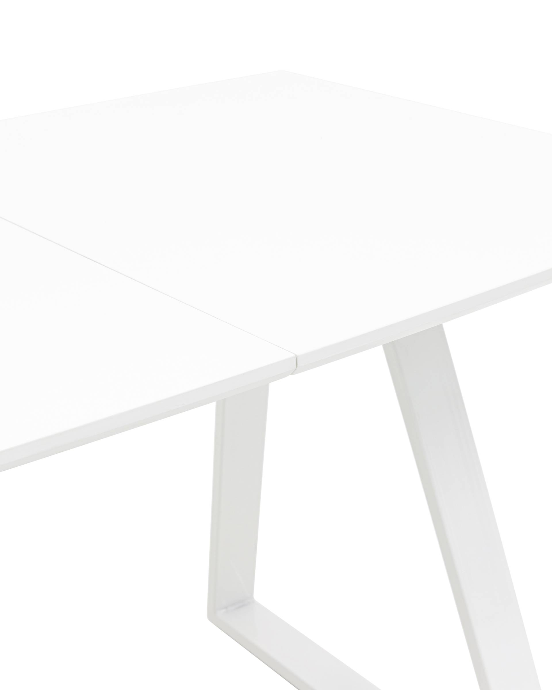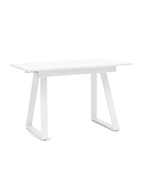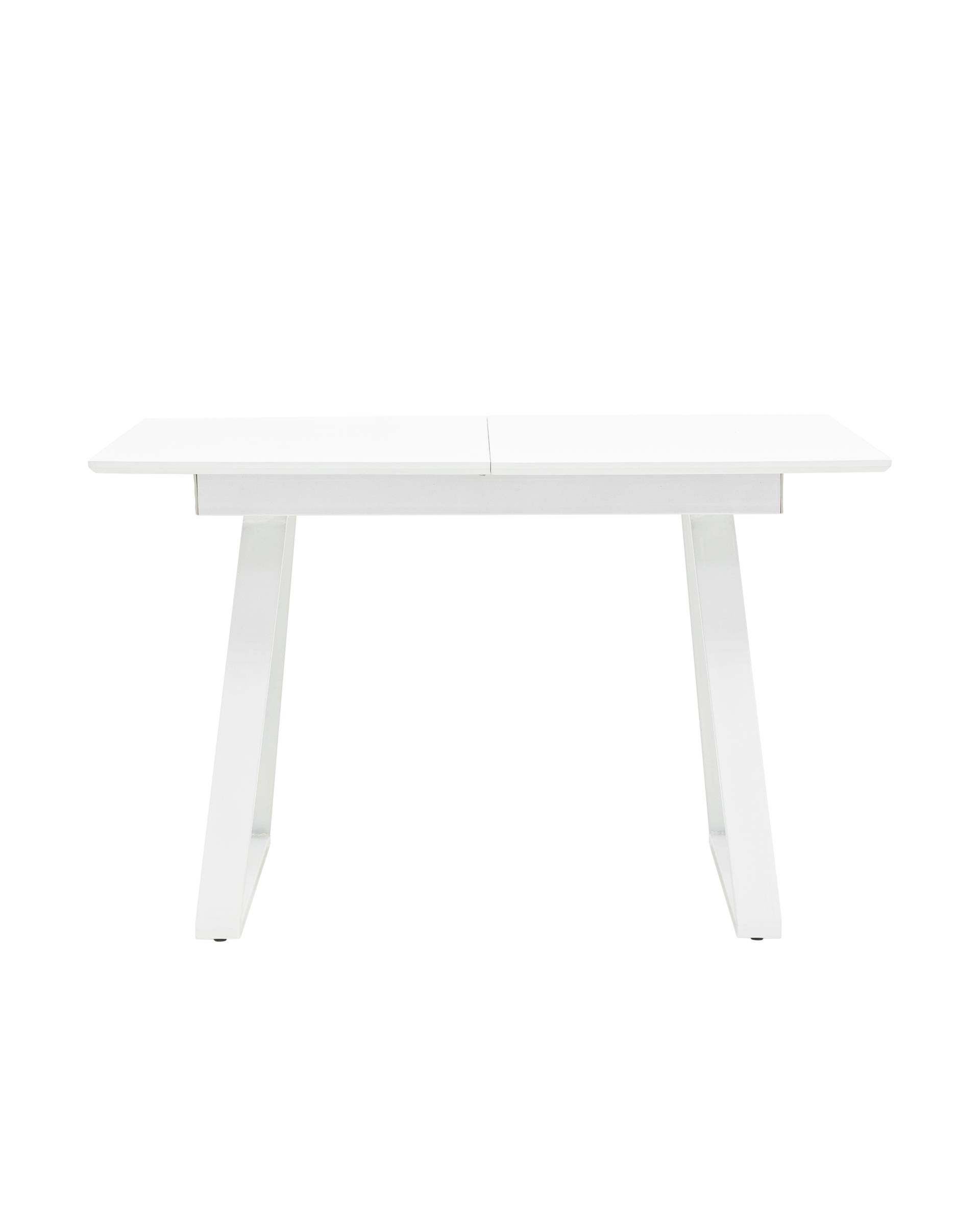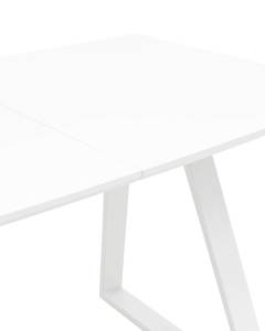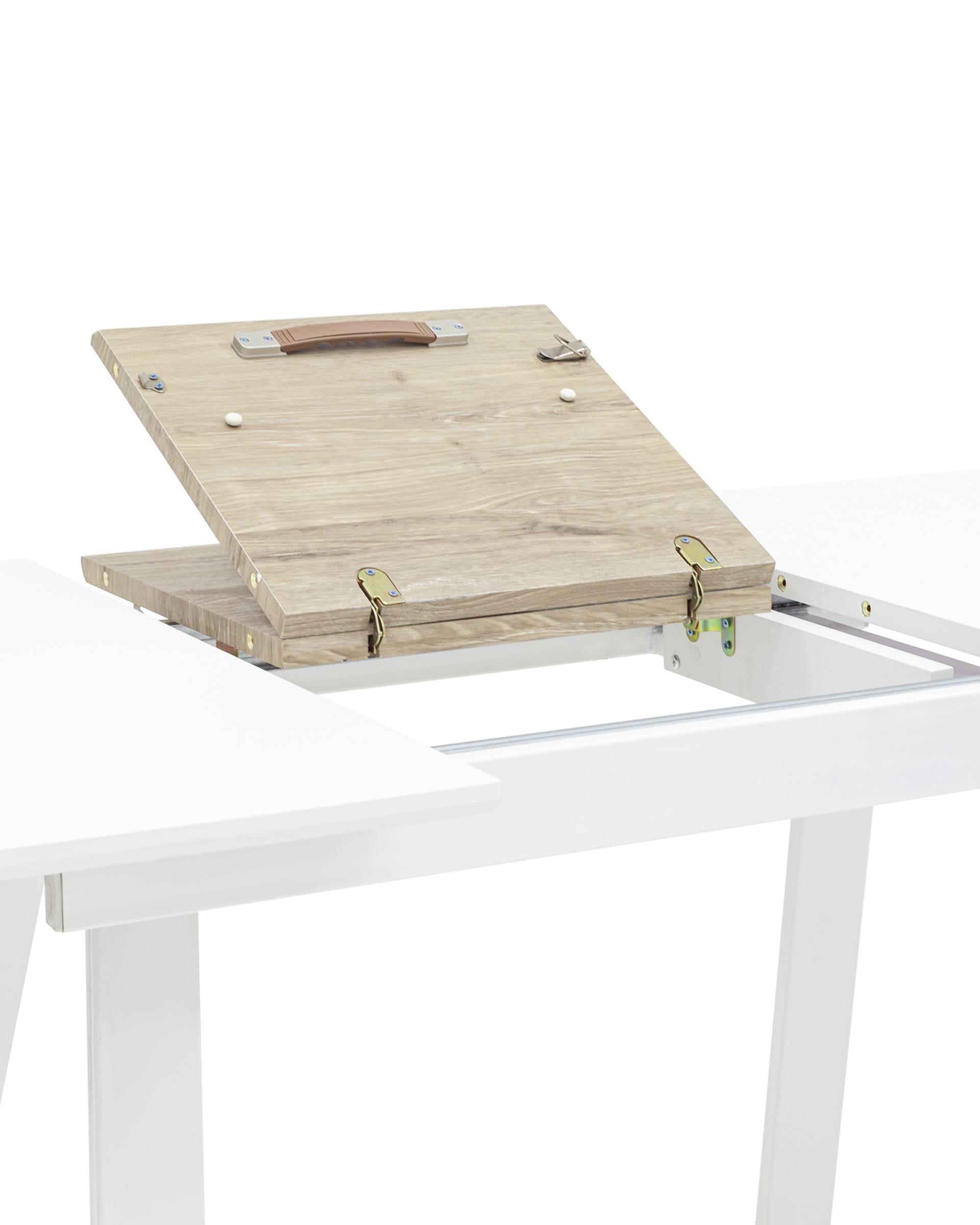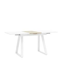 <p>Обеденный стол раскладной.</p><p>Столешница выполнена из прочного и долговечного МДФ. Светлая глянцевая поверхность столешницы гармонично сочетается с металлическими ножками белого цвета. Простая прямоугольная форма стола позволит легко вписать его в современный интерьер, стол украсит кухню, гостиную или современное кафе, ресторан.</p><p>Дополнительная вкладка стола выполнена из МДФ с бумажным шпоном цвета беленого дуба. На вкладке предусмотрена петля для комфортного открытия стола одной рукой.<br></p>