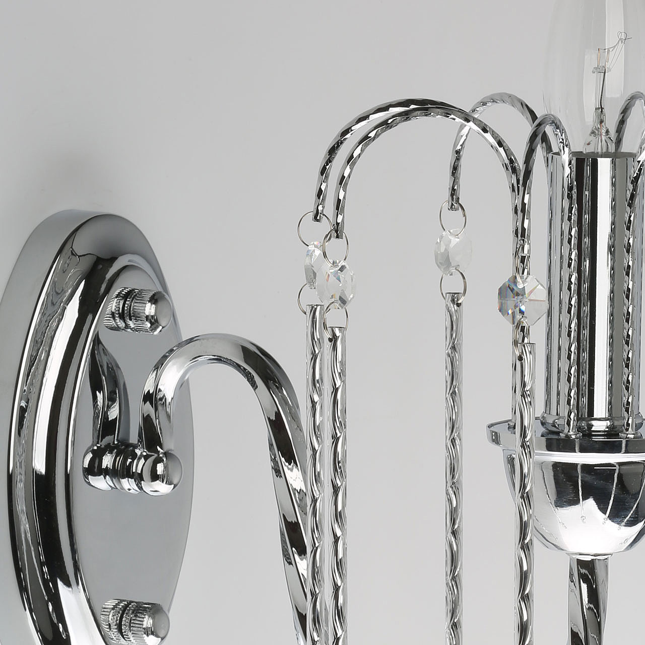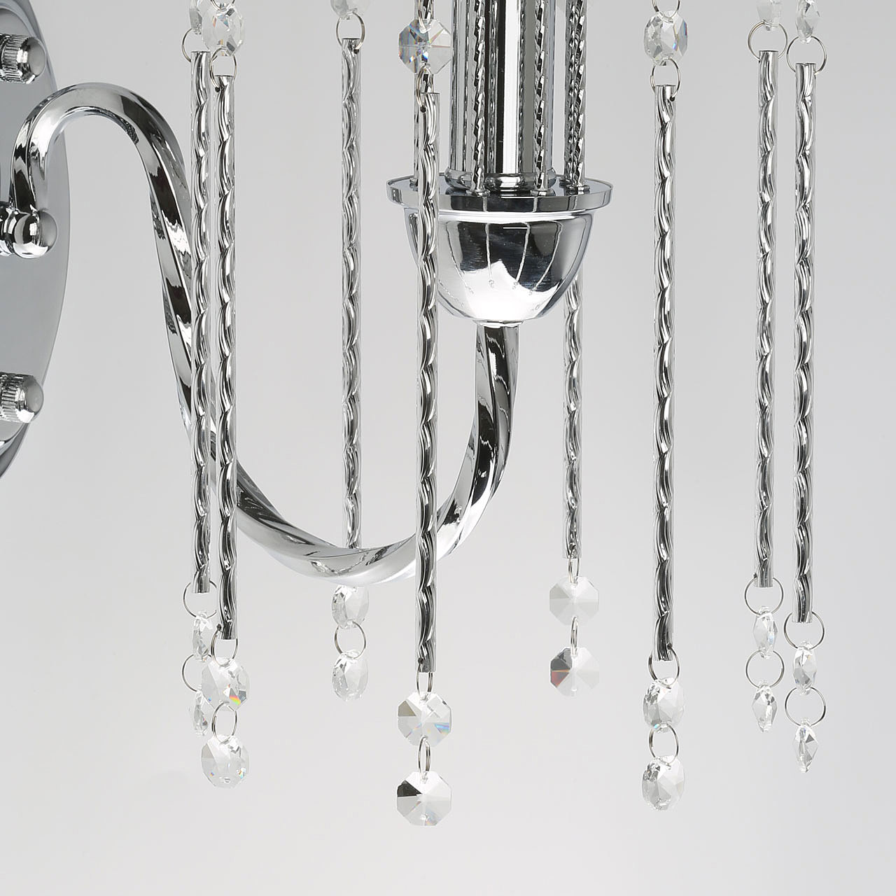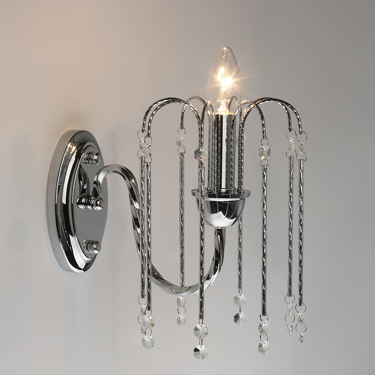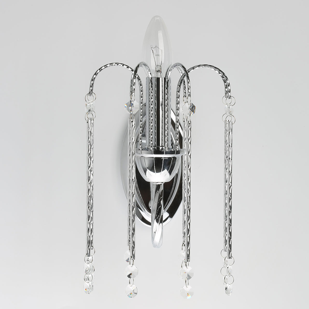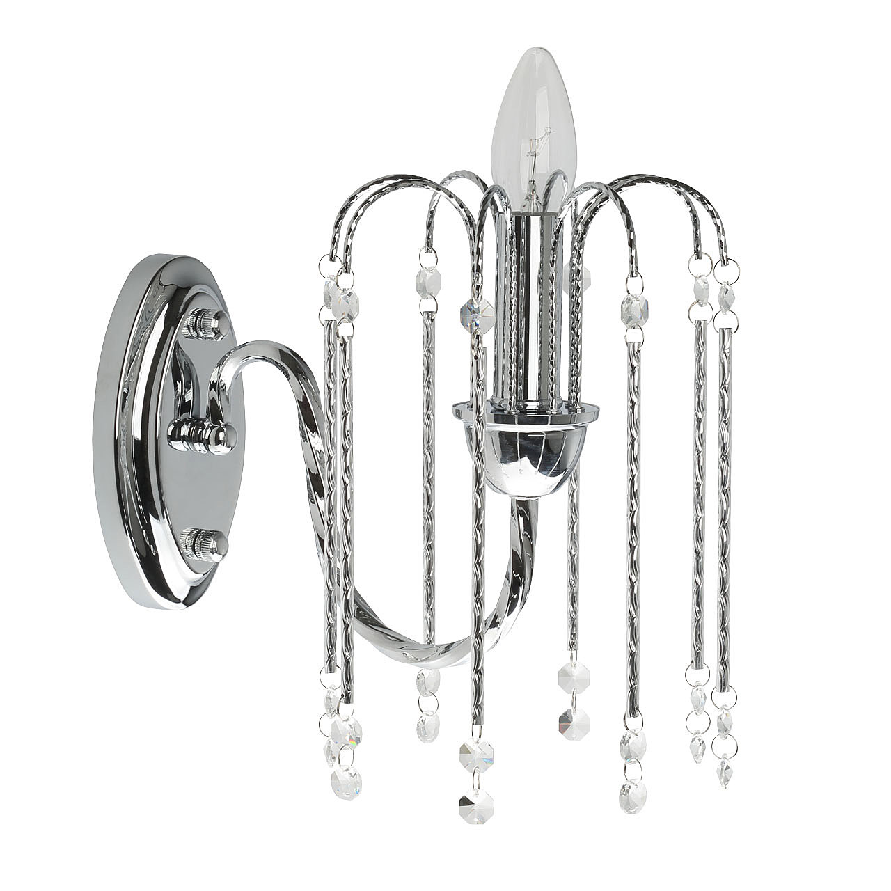 Оригинальный дизайн настенного бра придаст интерьеру легкости и воздушности.Хрусталь высокого качества создает красивую игру света.Витой рожок подчеркивает изящность настенного бра.Заменяемые лампы удобны в эксплуатации.