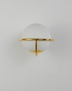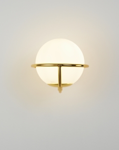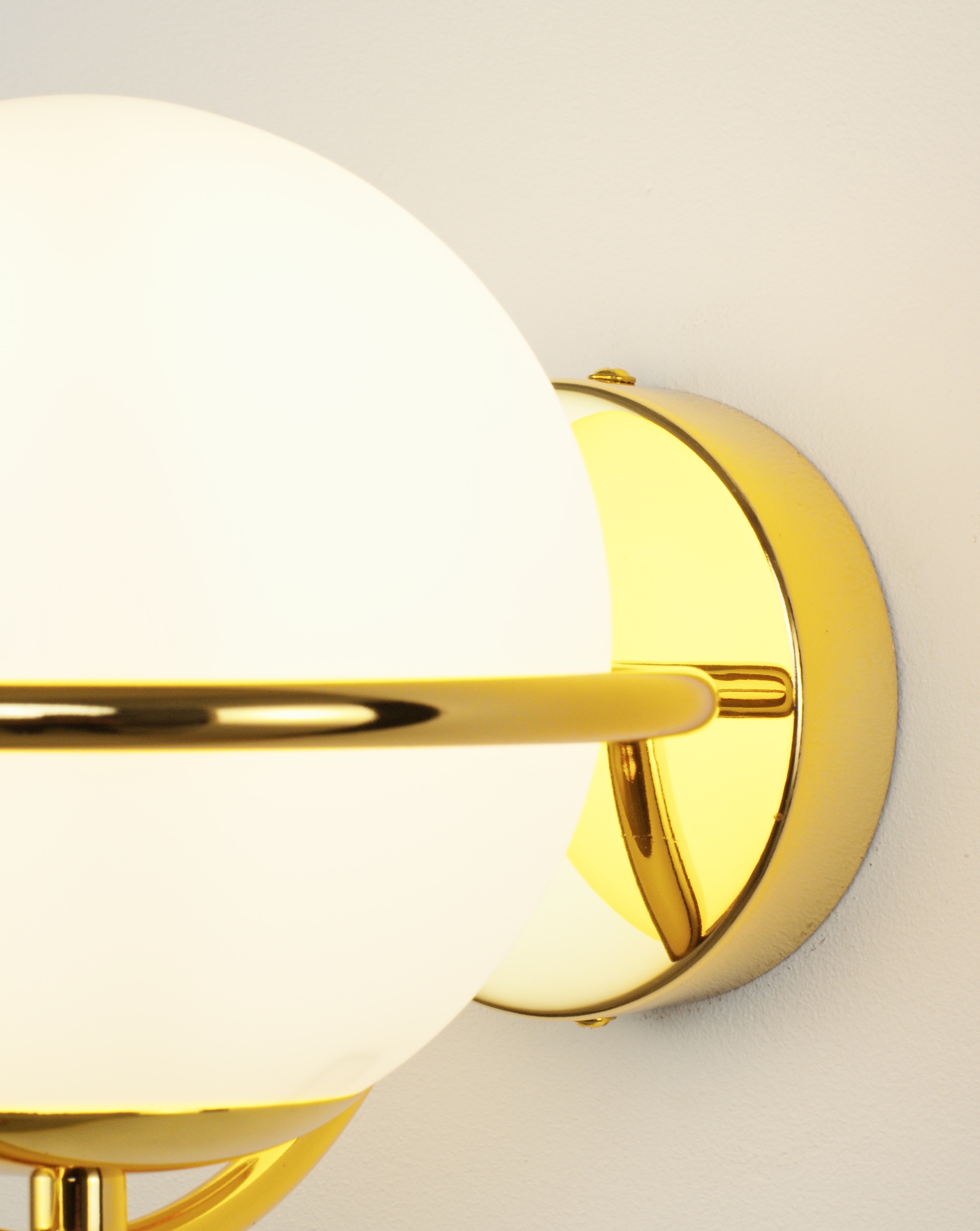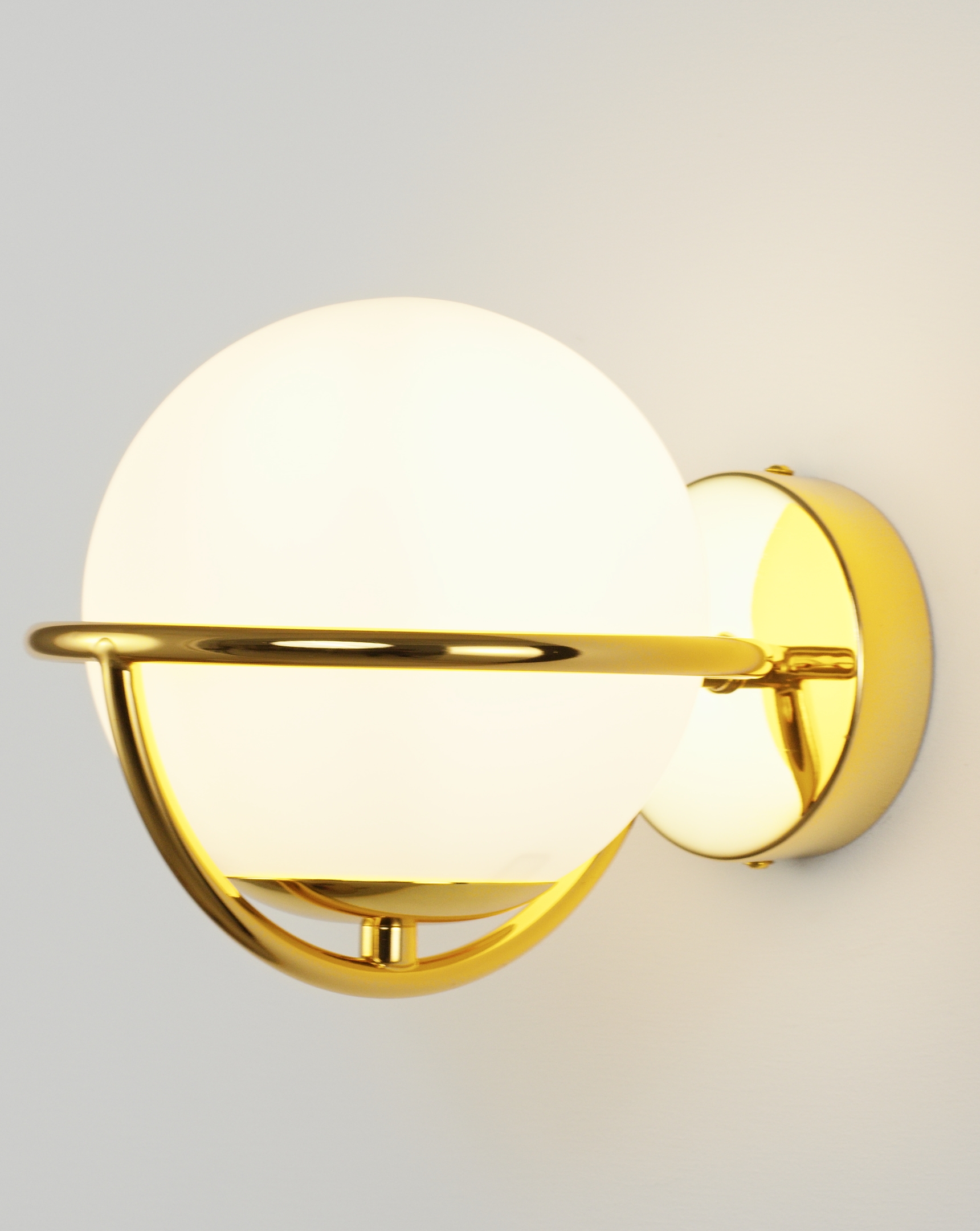 <p>Настенный светильник Diana. Сферичный плафон из матового стекла мягко рассеивает свет для комфортного освещения. Металлический каркас золотого цвета гармонично сочетается с матовым плафоном, а вся конструкция надежно крепится к стене на планку. Изящный и лаконичный дизайн бра поможет дополнить интерьер спальни, холла или гостиной.</p>