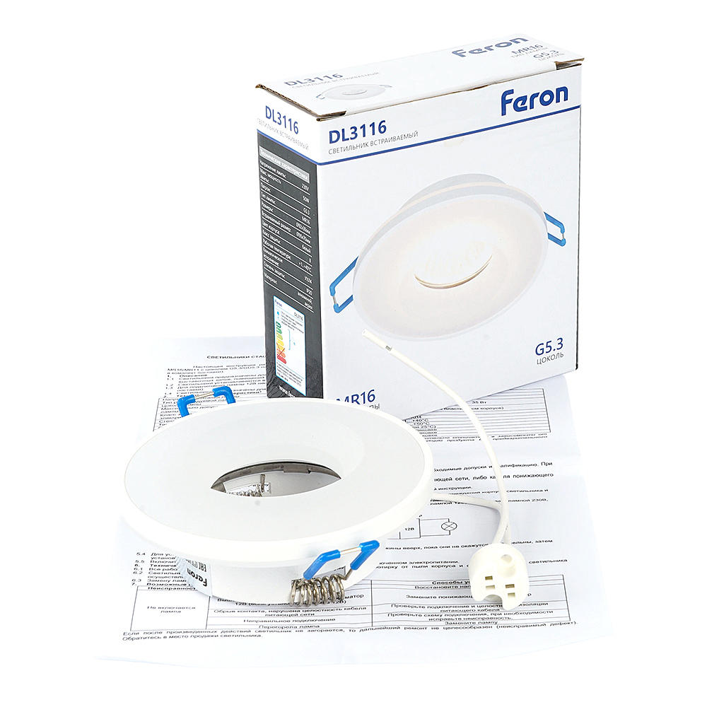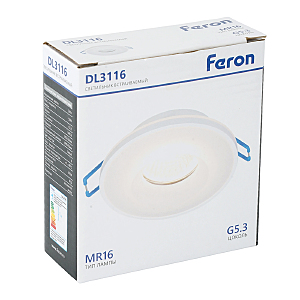 Светильник потолочный встраиваемый (-) FERON DL3116, под лампу G5.3 G5.3, белый, круг, 92*92*33 мм, монтажн.отв. 0*--мм, монтажный диаметр 90мм, корпус алюминий, акрил, неповоротный