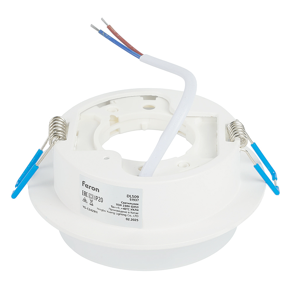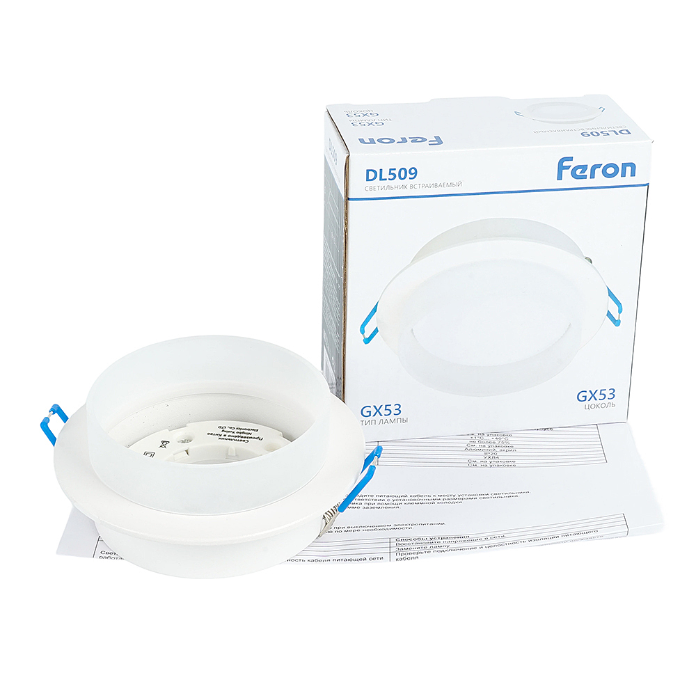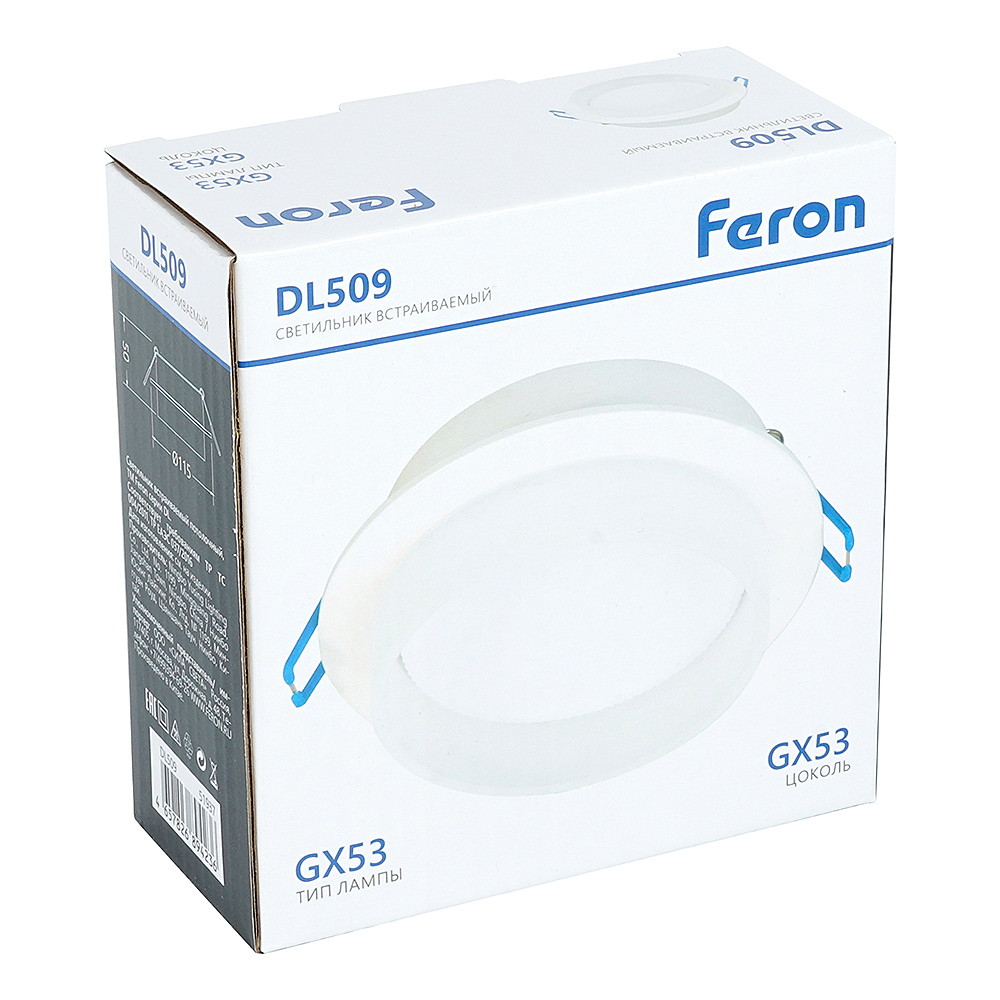 Светильник потолочный встраиваемый (-) FERON DL509, под лампу GX53 GX53, белый, круг, 108*108*46 мм, монтажн.отв. 0*--мм, монтажный диаметр 90мм, корпус алюминий, акрил, неповоротный