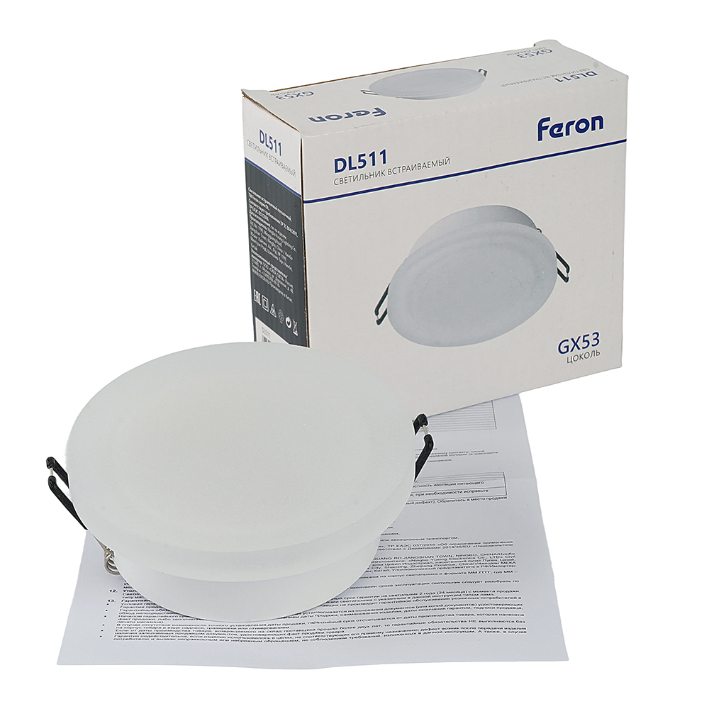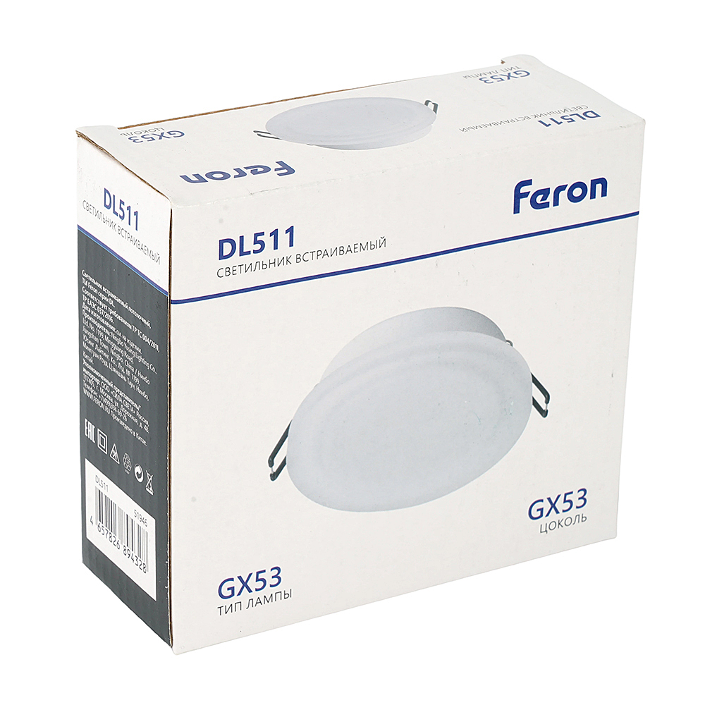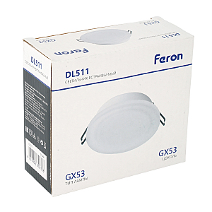 Светильник потолочный встраиваемый (-) FERON DL511, под лампу GX53 GX53, белый, круг, 105*105*36 мм, монтажн.отв. 0*--мм, монтажный диаметр 95мм, корпус алюминий, акрил, неповоротный
