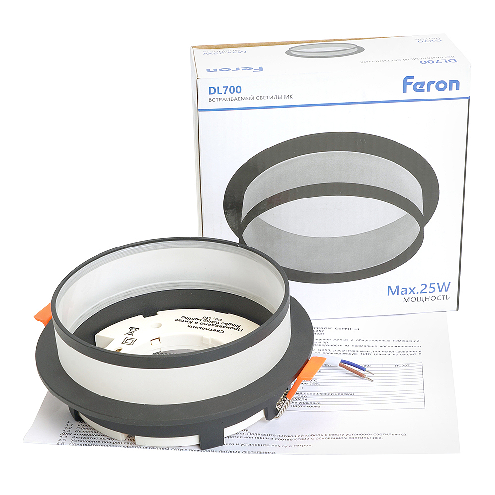 Светильник потолочный встраиваемый (ФВО) FERON DL700, под лампу GX70 GX70, черный, круг, 140*140*55 мм, монтажный диаметр 125мм, корпус металл+акрил, неповоротный