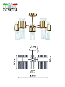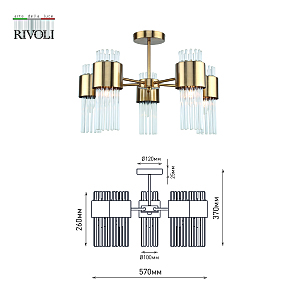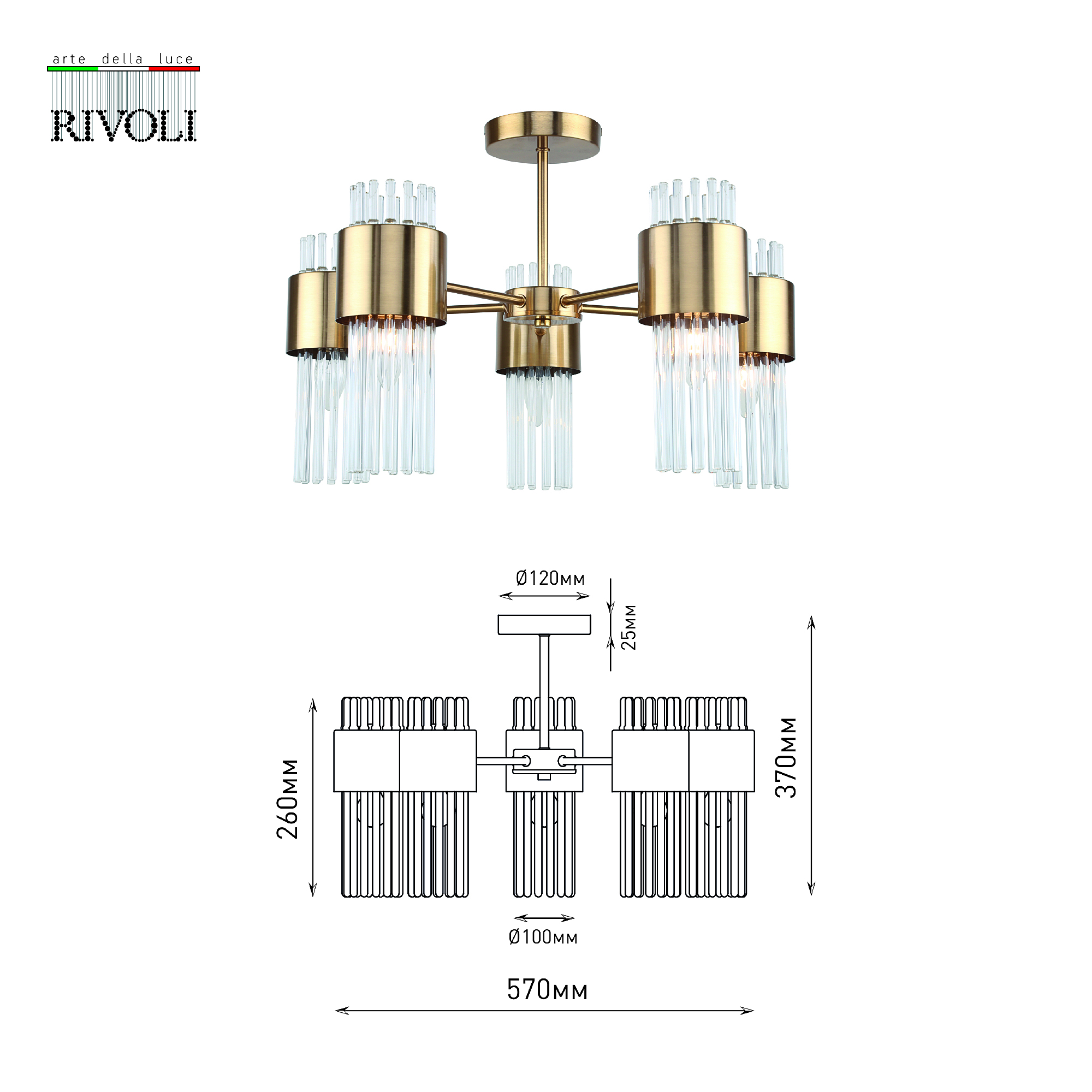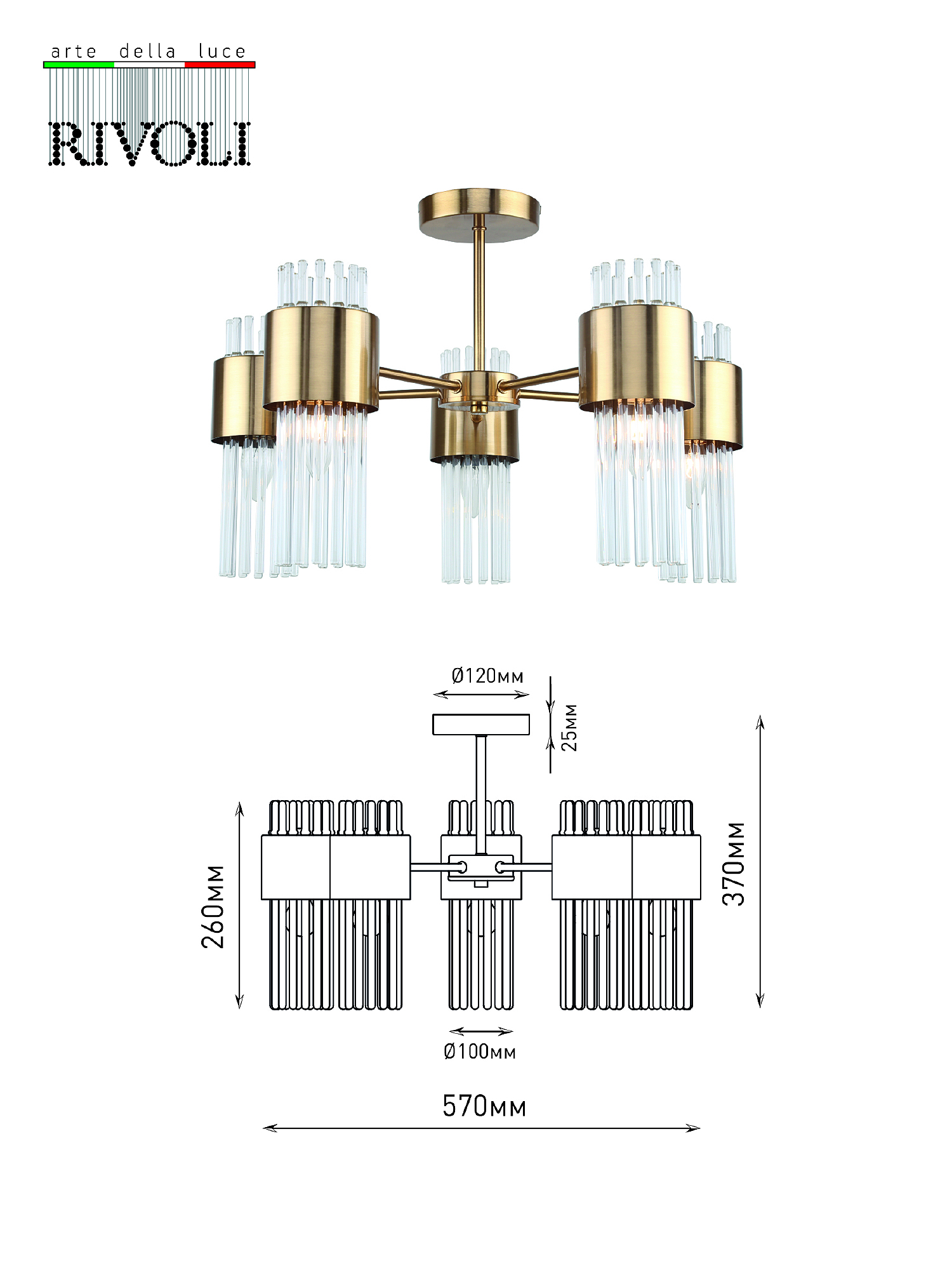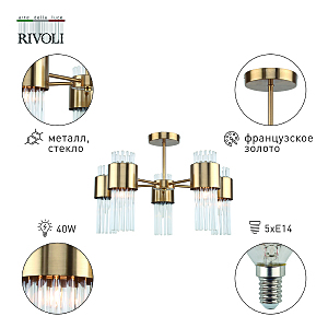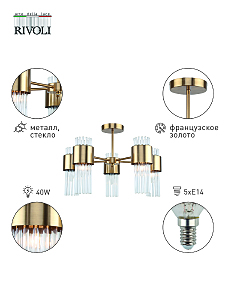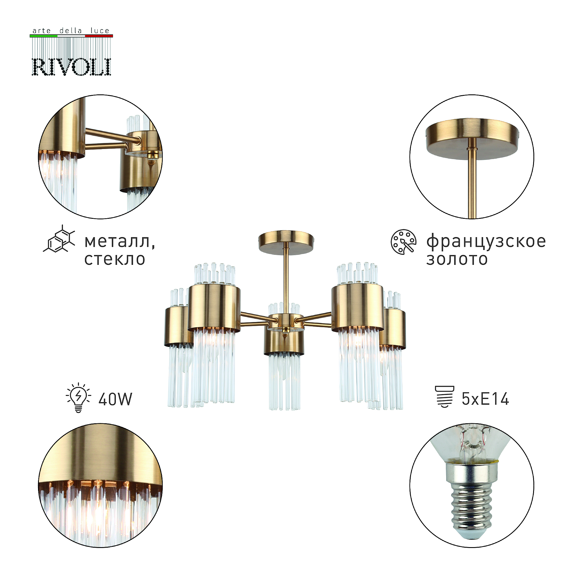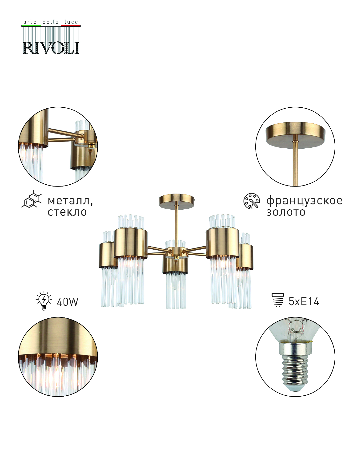 5-рожковая люстра на штанге в цвете французское золото, с трубчатыми стеклянными плафонами. Люстра потолочная применяется с 5 лампами Е14 мощностью 40 Вт, освещает площадь до 15 м2. Люстра с цилиндрическими плафонами из стекла будет удачно смотреться в гостиной, в спальне, на кухне, в кабинете, в загородном доме. Люстры и светильники коллекции Rivoli Donna подходят для оформления пространств сегмента horeca – рестораны, кафе, гостиницы. Эти люстры потолочные заказывают в интерьеры театров, концертных залов, фойе общественных пространств.В коллекции Rivoli Donna: люстра под 5 ламп - арт. 3149-305, люстра под 7 ламп - арт. 3149-307, светильник подвесной - арт. 3149-201, светильник настенный - арт. 3149-401.Итальянский бренд Rivoli выпускает аналогичную коллекцию в цвете хром - Rivoli Deborah: арт. 3148-401, 3148-305, 3148-307, 3148-201.