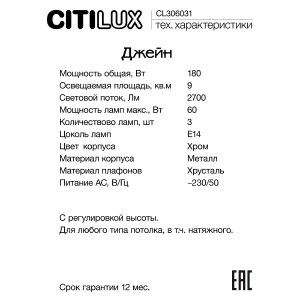 Допускается отличие страны-изготовителя, указанной в характеристиках. Линии производства могут находиться в нескольких государствах. Это не влияет на качество изготовления товара: все заводы данного бренда работают по общим стандартам, а готовые изделия проходят соответствующий контроль.Дания Коллекция Джейн ЦветЦвет арматуры Хром Цвет Хром Материал арматуры Металл Цвет плафона хром, прозрачный Материал плафона Металл, Хрусталь РазмерыВысота (мм) 1200 Диаметр (мм) 340 Высота минимальная (мм) 280 Ширина (мм) 340 ЭлектрикаКоличество ламп (шт) 3 Цоколь Е14 Тип лампы Накаливания, Светодиодные Мощность лампы (Вт) 60 Общая мощность (Вт) 180 Световой поток 2700 Площадь освещения 9 Дополнительная информацияСтепень защиты (IP) IP20 Тип подвеса На тросах Количество подвесов Много подвесных элементов -