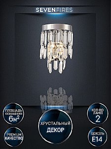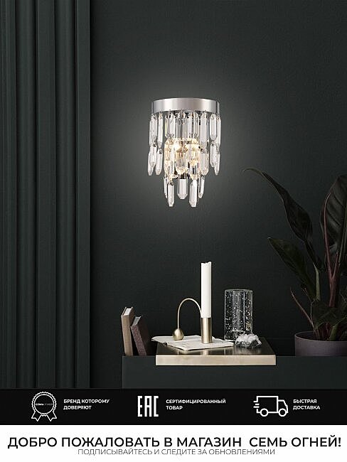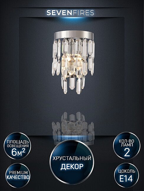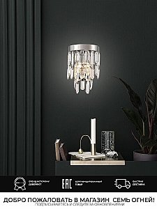 ПРЕИМУЩЕСТВА. Гальваническое покрытие цвета Хром. Хрусталь непревзойденного качества. Хорошие осветительные характеристики благодаря многогранности хрусталя. Длительный срок службы. ПРИМЕНЕНИЕ. Светильник настенный предназначен для дополнительного освещения помещений-гостиная, зал, спальня, кухня, прихожая, детская. Используемые материалы - металл, хрусталь. Источник света-лампы накаливания мощностью до 40Вт,светодиодные лампы мощностью до 12Вт. Крепление накладным способом монтажной планки шурупами. Светильник настенный изготовлен из высококачественных материалов и является безопасным для человека, животных и окружающей среды.. Семь Огней создает продукт от эскиза до готового шедевра. Над созданием светильников трудятся одни из лучших дизайнеров и конструкторов.Наша компания предъявляет высокие требования к производимой продукции, что подтверждено сертификатами качества.