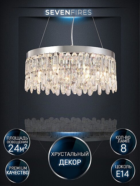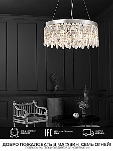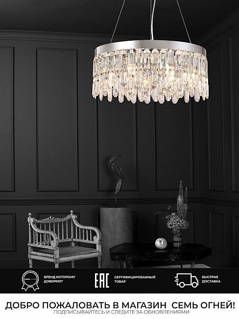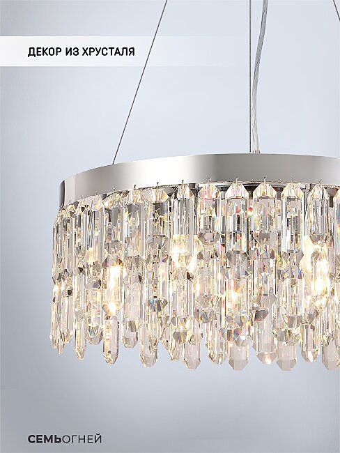 ПРЕИМУЩЕСТВА. Гальваническое покрытие цвета Хром. Хрусталь непревзойденного качества. Хорошие осветительные характеристики благодаря многогранности хрусталя. Длительный срок службы. ПРИМЕНЕНИЕ. Люстра подвесная предназначена для основного освещения помещений-. гостиная,зал,спальня,прихожая,детская,кухня. Можно регулировать высоту люстры изменением длины провода. Используемые материалы-металл,хрусталь. Источник света-лампы накаливания мощностью до 40Вт,светодиодные лампы мощностью до 12Вт. Крепление накладным способом монтажной планки шурупами. Удобный крепеж подойдет под все виды потолков-бетон,гипсокартон,натяжные и деревянные потолки. Люстра подвесная изготовлена из высококачественных материалов и является безопасной для человека и окружающей среды.. Семь Огней создает продукт от эскиза до готового шедевра. Над созданием светильников трудятся одни из лучших дизайнеров и конструкторов. Наша компания предъявляет высокие требования к производимой продукции, что подтверждено сертификатами качества.