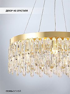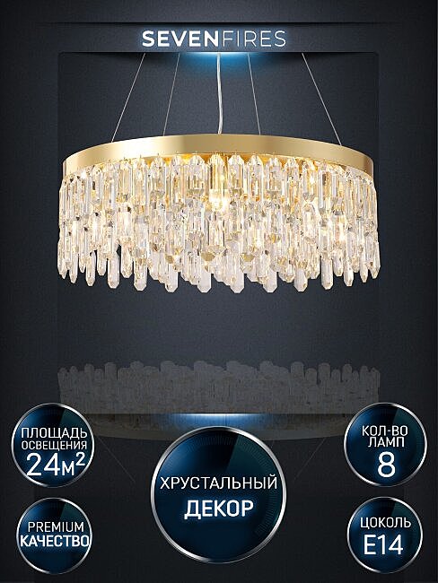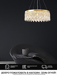 ПРЕИМУЩЕСТВА. Гальваническое покрытие цвета Золото. Хрусталь непревзойденного качества. Хорошие осветительные характеристики благодаря многогранности хрусталя. Длительный срок службы. ПРИМЕНЕНИЕ. Люстра подвесная предназначена для основного освещения помещений-. гостиная,зал,спальня,прихожая,детская,кухня. Можно регулировать высоту люстры изменением длины провода. Используемые материалы-металл,хрусталь. Источник света-лампы накаливания мощностью до 40Вт,светодиодные лампы мощностью до 12Вт. Крепление накладным способом монтажной планки шурупами. Удобный крепеж подойдет под все виды потолков-бетон,гипсокартон,натяжные и деревянные потолки. Люстра подвесная изготовлена из высококачественных материалов и является безопасной для человека и окружающей среды.. Семь Огней создает продукт от эскиза до готового шедевра. Над созданием светильников трудятся одни из лучших дизайнеров и конструкторов. Наша компания предъявляет высокие требования к производимой продукции, что подтверждено сертификатами качества.