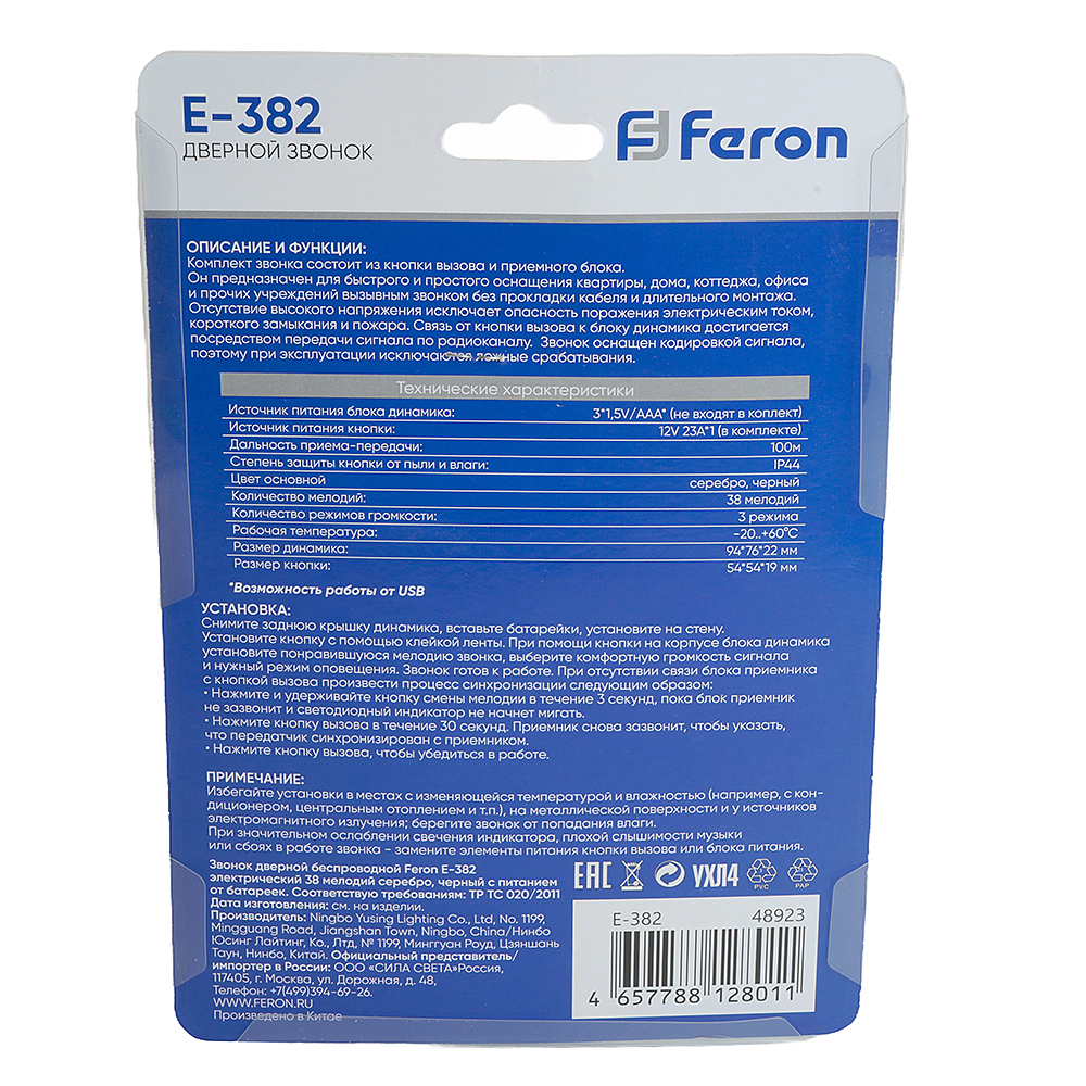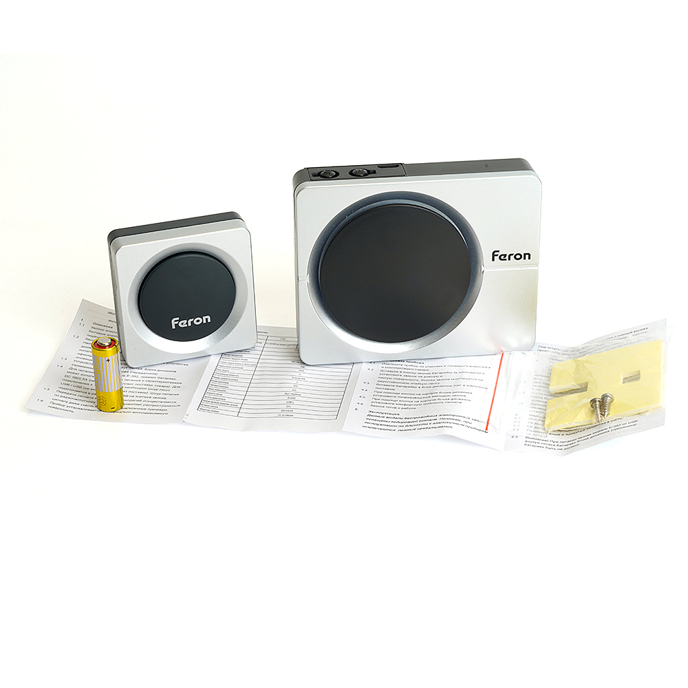 Звонок электрический дверной беспроводной FERON E-382, 38 мелодий, дальность действия 100м, цвет серебро/черный, регулировка громкости - есть, шифрование сигнала - есть; БАЗА: 3*1,5V/AAA, 94*76*22 мм, КНОПКА: IP44, 12V 23A*1 (в комплекте) , раб.t -20..+60градусовС , размер кнопки 54*54*19мм