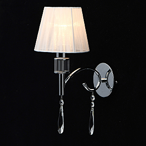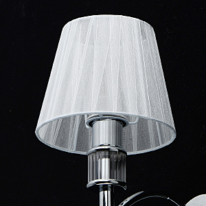 Универсальный цвет глянцевого хрома для современных интерьеров.Декоративные розетки и хрустальные подвески украшают светильник.Многослойная органза абажура создает мягкое освещение.Полная семья из бра, потолочных светильников на 5 и 8 ламп.