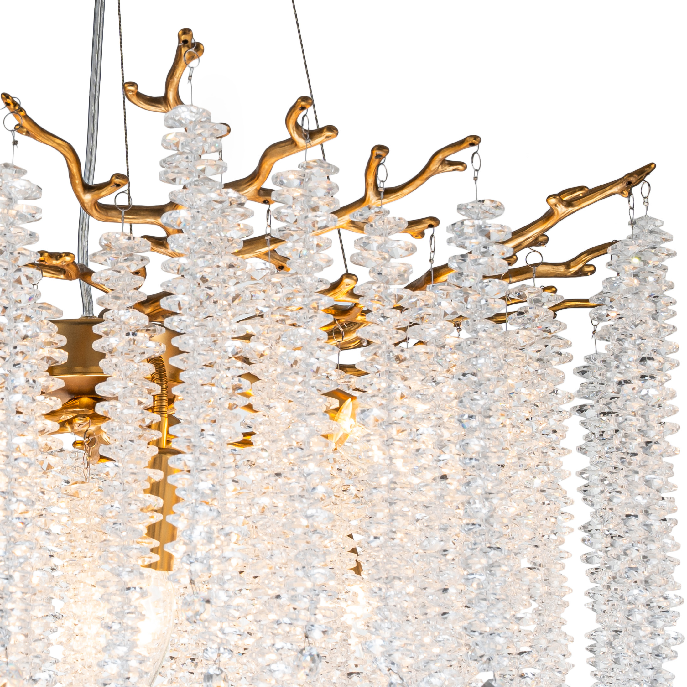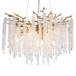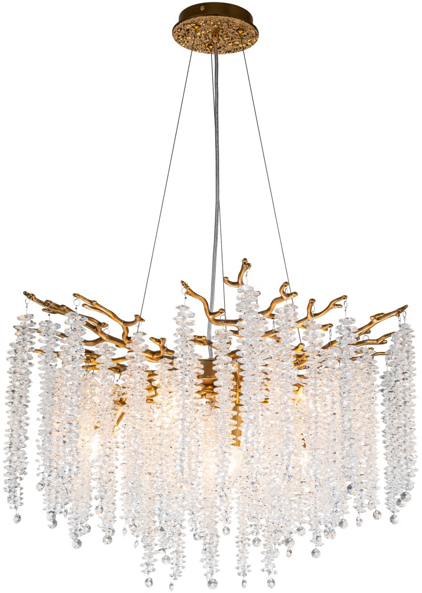 Люстра подвесная коллекции EIVA выполнена из сплава алюминия, гальванизирована в цвет бронзы и декорирована гроздьями из хрусталя в форме октагон. Светильники коллекции отличает увеличенное количество хрусталя (76 хрустальных гроздьев), фактурная чеканка на потолочной чаше и лампы с цоколем Е14. Из данной коллекции светильников можно сделать индивидуальный заказ любого цвета и размера.