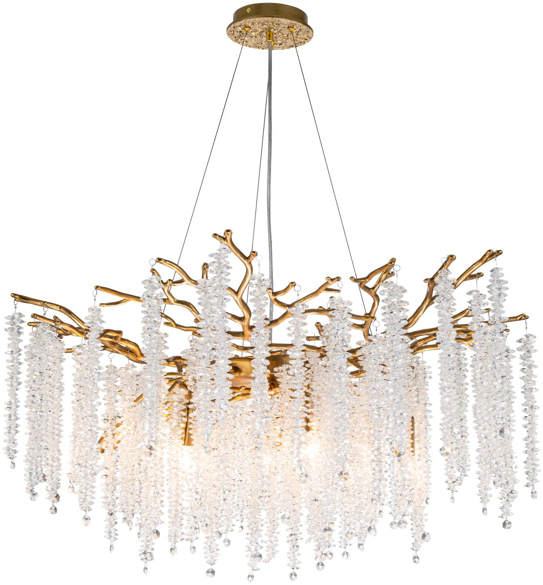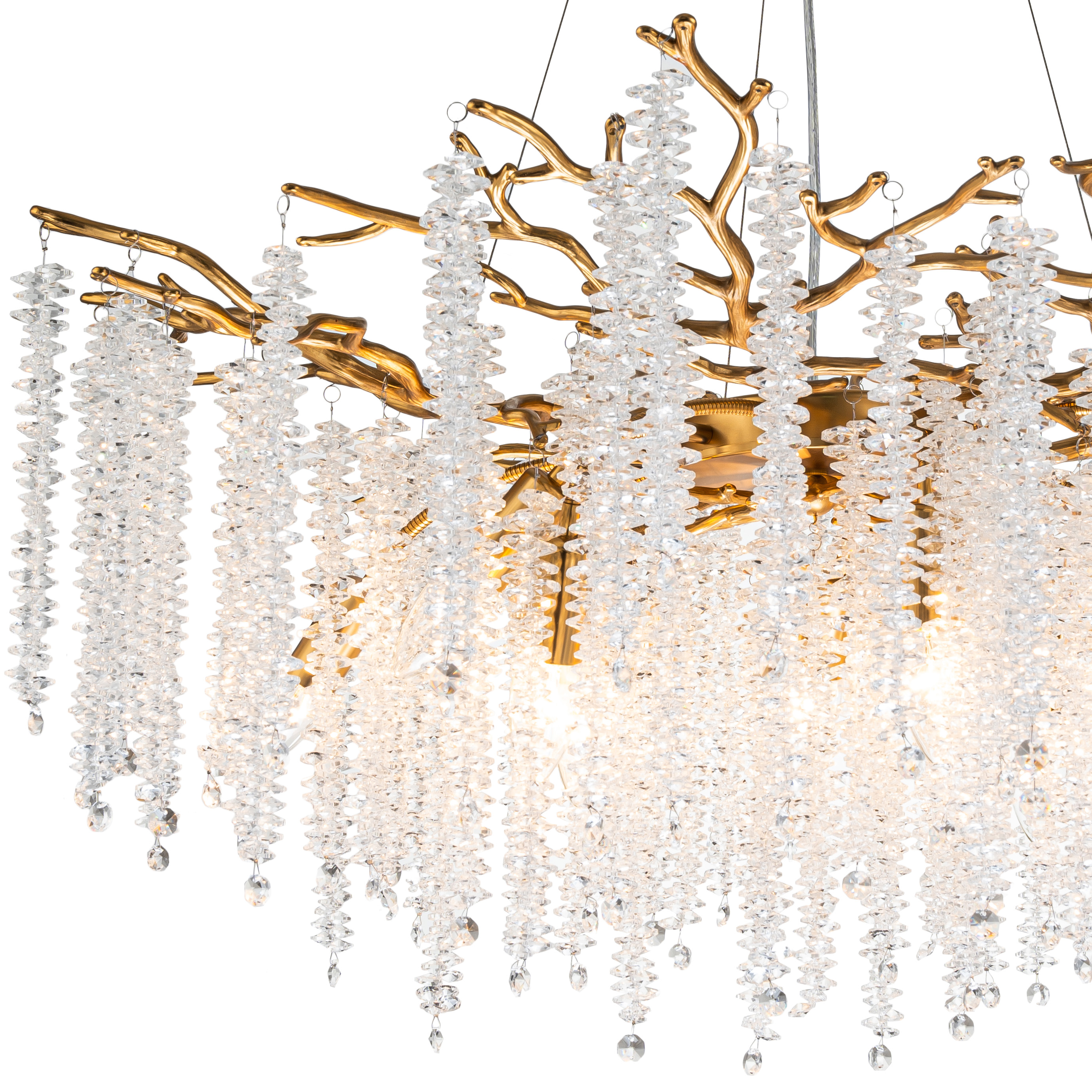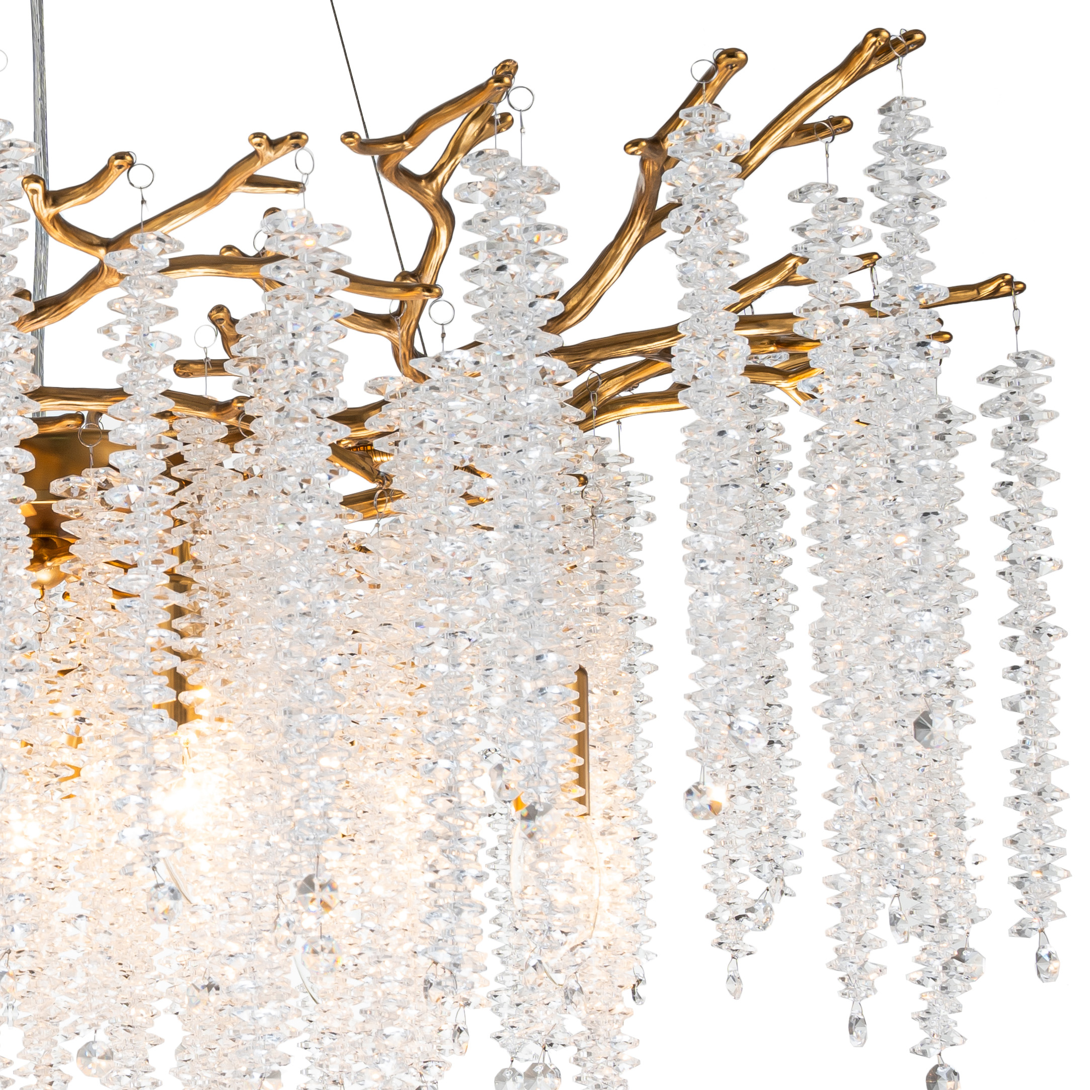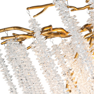 Люстра подвесная коллекции EIVA выполнена из сплава алюминия, гальванизирована в цвет бронзы и декорирована гроздьями из хрусталя в форме октагон. Светильники коллекции отличает увеличенное количество хрусталя (101 гроздь), фактурная чеканка на потолочной чаше и лампы с цоколем Е14. Из данной коллекции светильников можно сделать индивидуальный заказ любого цвета и размера.