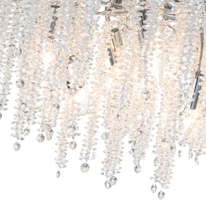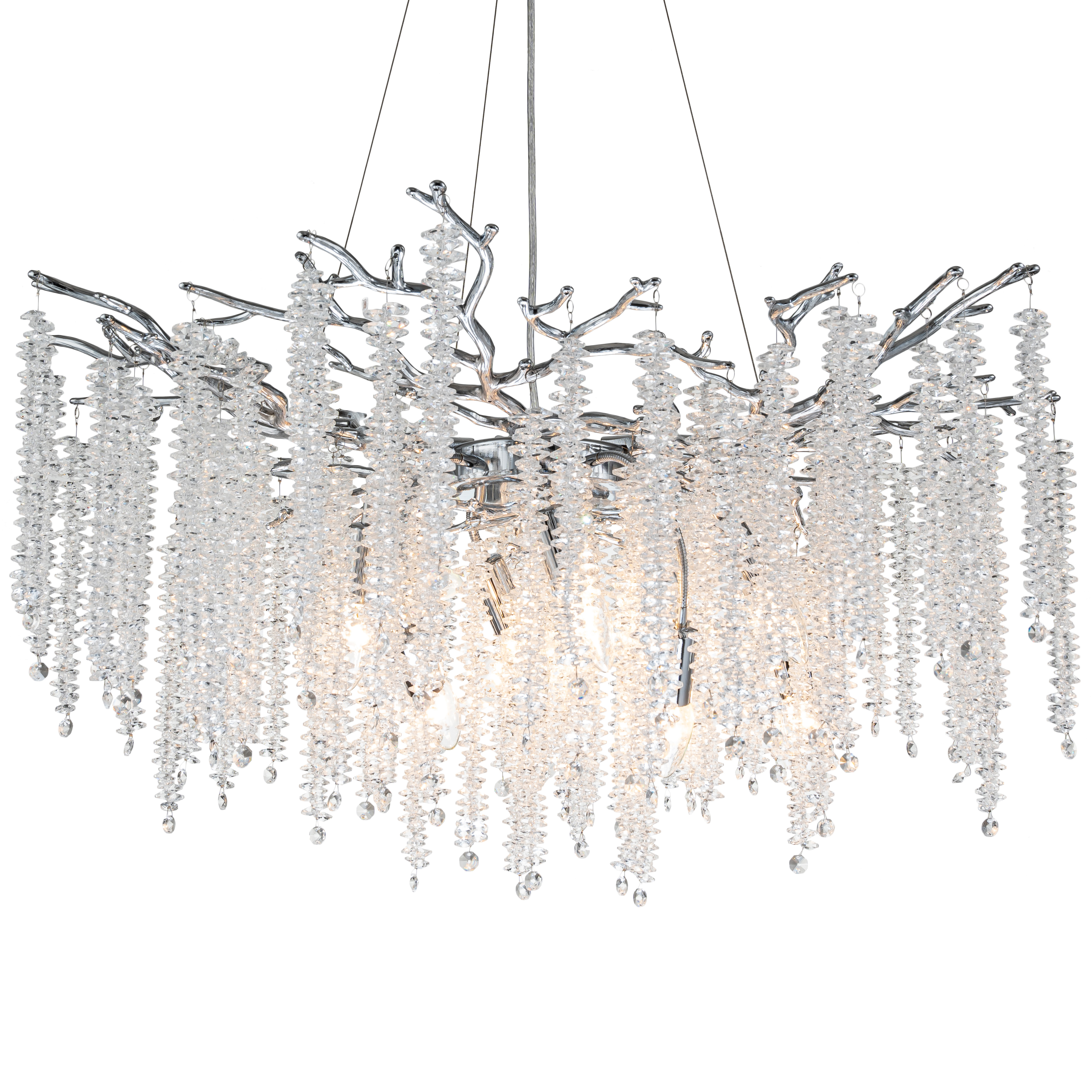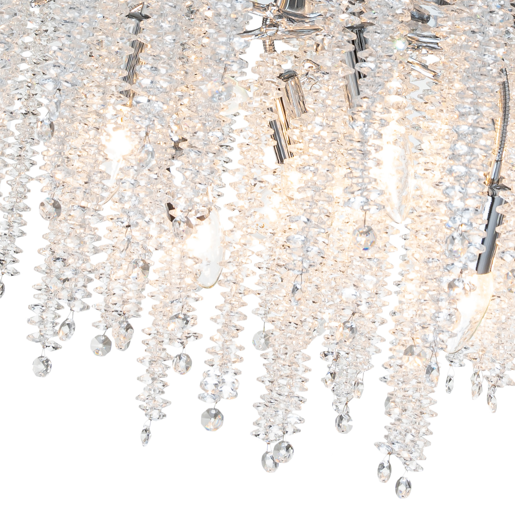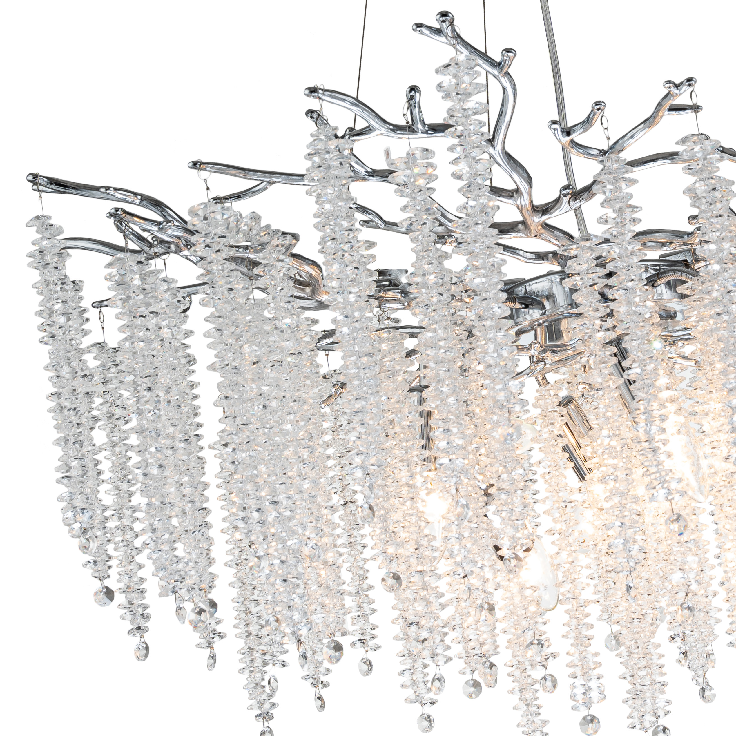 Люстра подвесная коллекции EIVA выполнена из сплава алюминия, гальванизирована в цвет хрома и декорирована гроздьями из хрусталя в форме октагон. Светильники коллекции отличает увеличенное количество хрусталя (101 гроздь), фактурная чеканка на потолочной чаше и лампы с цоколем Е14. Из данной коллекции светильников можно сделать индивидуальный заказ любого цвета и размера.